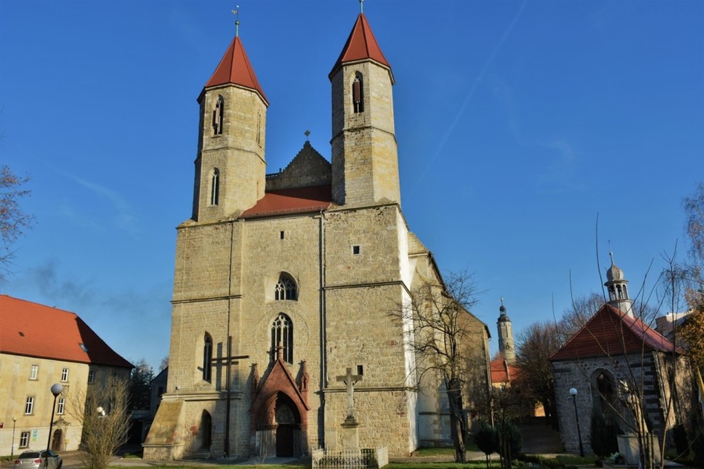 Pierwszy kościół parafialny wznieśli na początku XIII stulecia joannici, czyli rycerski zakon walczący w Ziemi Świętej. Po spaleniu drewnianej świątyni postanowiono zbudować w tym samym miejscu romańską budowlę, lecz tym razem z miejscowego piaskowca. Miała ona prawdopodobniej formę trójnawowej bazyliki. Z powodu późniejszej, gotyckiej przebudowy, znacznie czytelniejszą dla turystów będzie zachowany front wieżowy. Romańska fasada świątyni (ob. pw. WNMP), to dwie kwadratowe wieże (lewa nieco przebudowana) w łączącej się z fasadą podstawie z wczesnogotyckim portalem. Niestety romańską rozetę z czasem zamurowano przez wstawienie weń częściowo późnogotyckiego okna. Pozostał jedynie wyraźny ślad, a właściwie obramienie po niemal 800-letnim, niegdyś przepięknym ornamencie architektonicznym...