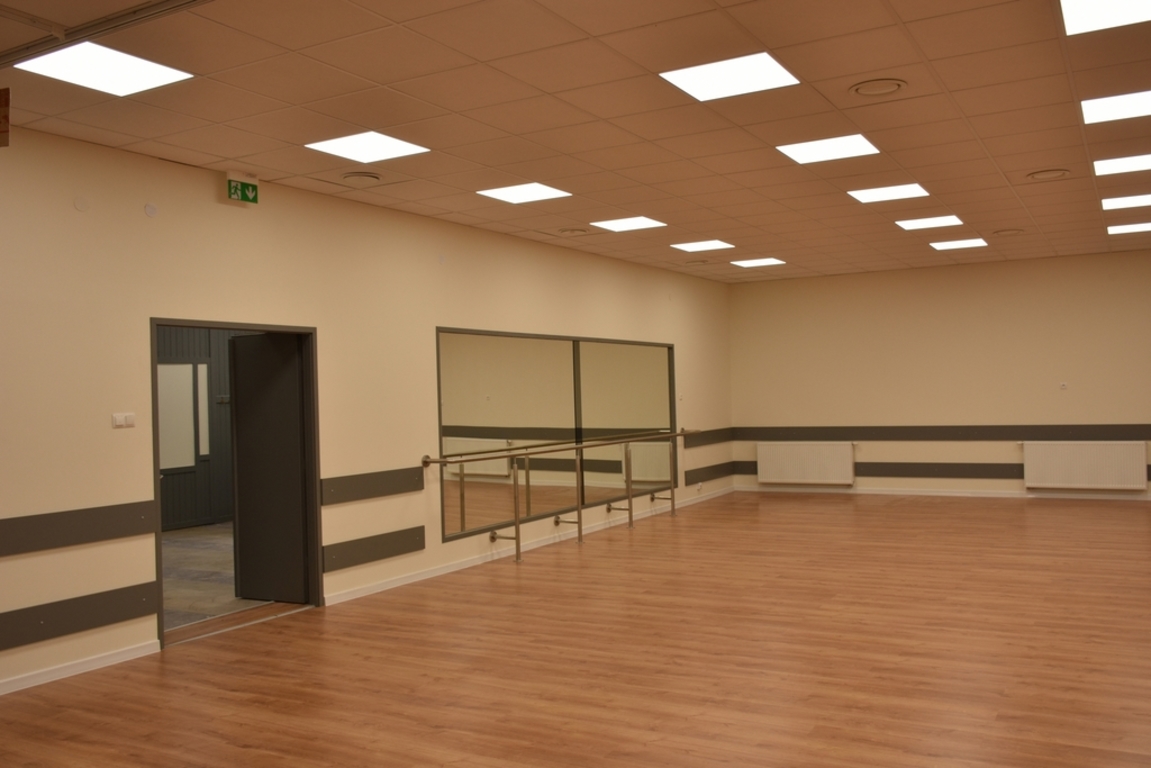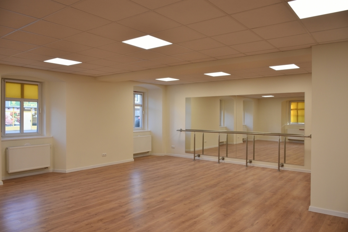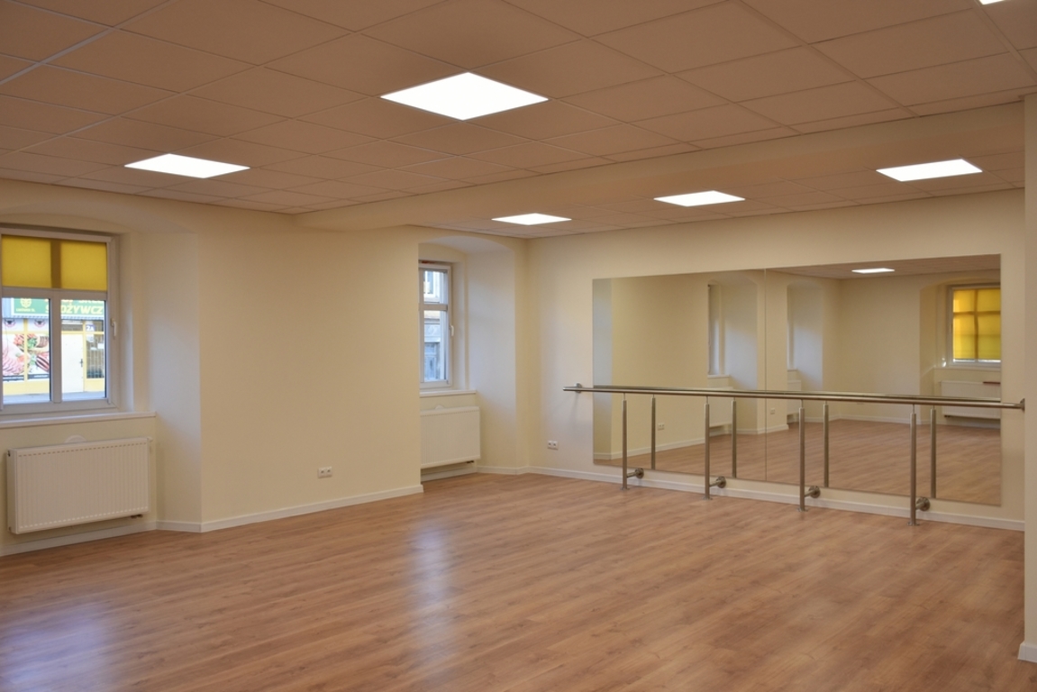i wewnętrznych, bieżący remont pomieszczeń parteru oraz piętra w zakresie wszystkich branż (instalacji elektrycznej, komputerowej, sanitarnej), wykonanie robót tynkarskich i malarskich we wszystkich pomieszczeniach, wymianę części posadzek, podłóg i płytek ceramicznych na ścianach w pomieszczeniach sanitarnych, wymianę posadzek i podłóg w części pomieszczeń, utworzenie na parterze pomieszczenia sanitarnego, wymianę stolarki drzwiowej oraz konserwacja istniejącej pozostawionej, malowanie elewacji wraz z uzupełnieniem tynków, przebudowę instalacji centralnego ogrzewania, profesjonalne wytłumienie akustyczne ścian pomieszczenia sali prób, podział pomieszczenia na garderobę i archiwum. W trakcie wykonywania robót wykonano także roboty dodatkowe w tym m.in. nowy strop podwieszony na sali tanecznej. Tego typu roboty pojawiają się zwykle przy remoncie zużytych technicznie i funkcjonalnie budynków.