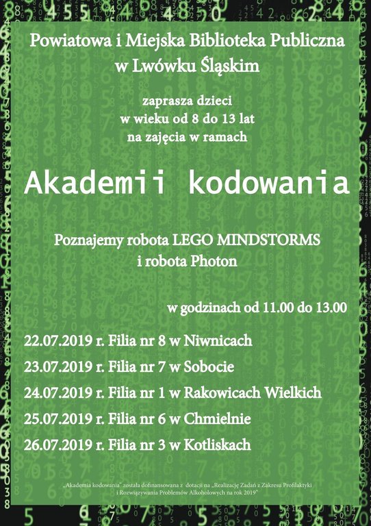 - W przyszłym tygodniu będą się odbywały zajęcia w poszczególnych filiach bibliotecznych na terenie Gminy Lwówek Śl. Zaczynamy 22 lipca w Niwnicach, następnego dnia w Sobocie, 24 lipca w Rakowicach Wielkich, kolejnego dnia w Chmielnie, a 26 lipca Kotliskach. Zajęcia będą trwać po trzy godziny, od 11.00 do 13.00. W trakcie zajęć dzieci zapoznają się z działaniem robota LEGO MINDSTORMS oraz robotów Photon, za pomocą których poznają podstawy programowania (przez zabawę). W sierpniu będzie cały cykl spotkań również w Oddziale Dziecięco-Młodzieżowym w ratuszu, o czym poinformujemy w późniejszym terminie. - mówi Joanna Kret, instruktor i kustosz Powiatowej i Miejskiej Biblioteki Publicznej w Lwówku Śląskim.