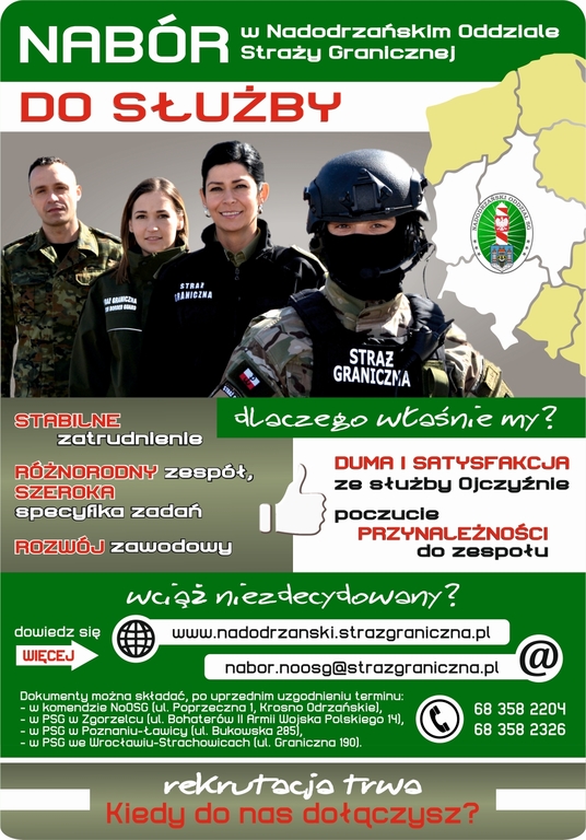 Komendant Nadodrzańskiego Oddziału SG wznowił nabór do służby w Straży Granicznej, który będzie trwał do końca 2019 roku: - Pozyskanie nowych funkcjonariuszy do służby przyczyni się do poprawy bezpieczeństwa w rejonie służbowej odpowiedzialności - informuje nas zastępca Komendanta Placówki SG w Zgorzelcu kpt. SG Julia Mandecka.