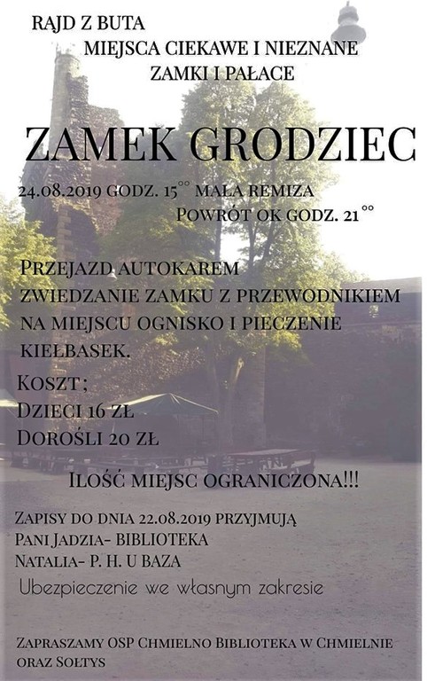 24 sierpnia spod małej remizy wyruszy wycieczka na zamek Grodziec. Po zwiedzeniu piastowskiej warowni, zostanie rozpalone ognisko, przy którym będzie można upiec pyszne kiełbaski. To kolejny pomysł, po rajdzie zrealizowanym w pierwszej połowie wakacji: