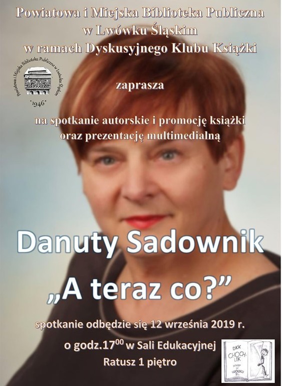 Dnia 12 września br. w Sali Edukacyjnej położonej na pierwszym piętrze ratusza o godz. 17.00 odbędzie się spotkanie z Danutą Sadownik, autorką książki pt. "A teraz co?". Impreza kulturalna wzbogacona zostanie o prezentację multimedialną. Zapraszamy!