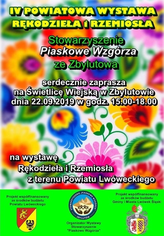Stowarzyszenie "Piaskowe Wzgórza" serdecznie zaprasza na świetlicę wiejską w Zbylutowie. 22 września 2019 r. w godzinach 15.00-18.00 będzie tam miała miejsce wystawa rękodzieła i rzemiosła z terenu powiatu lwóweckiego.