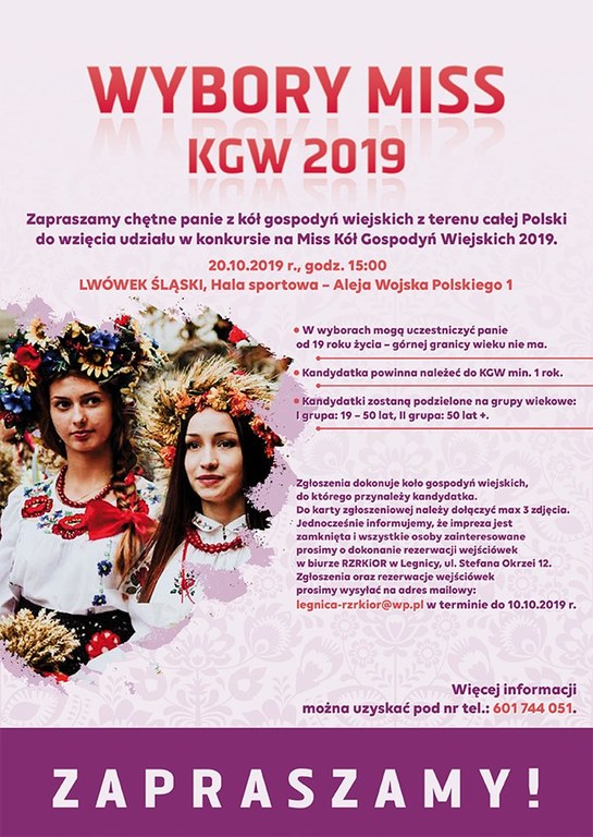 Zachęcamy nasze Panie, które ukończyły 19 lat (uwaga - nie ma górnej granicy wiekowej) i zarazem mają za sobą minimum roczny staż w KGW. Zapisy trwają do 10 października. Korzystając z okazji już dziś zapraszamy na niecodzienną impreza, która będzie miała miejsce 20 października w hali sportowej w Lwówku Śląskim!