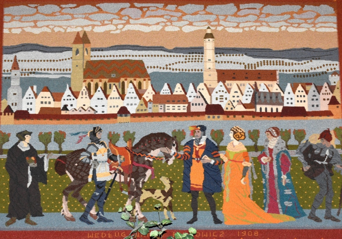 Kompozycja składa się z trzech podzielonych płaszczyzn, które wspólnie tworzą treść utkanego obrazu. W dolnej partii została umieszczona scena figuralna, przedstawiająca parę zamożnych mieszczan na przechadzce poza murami miasta. Na ramieniu mężczyzny wspiera się młoda kobieta, której towarzyszy matka lub przyjaciółka. Obok widzimy wędrowca, zaś z drugiej strony zbliżającego się rycerza z mieczem i otwartą przyłbicą. Towarzyszy mu osiodłany koń oraz pies myśliwski. Za rycerzem podąża uczony.