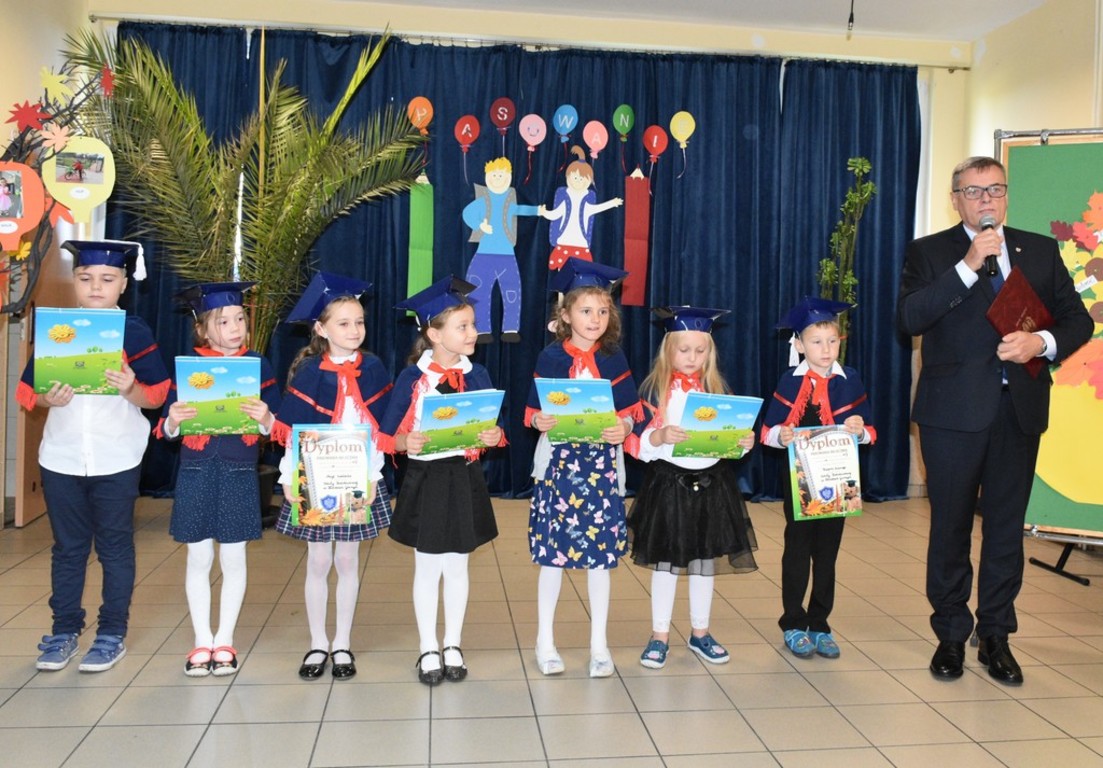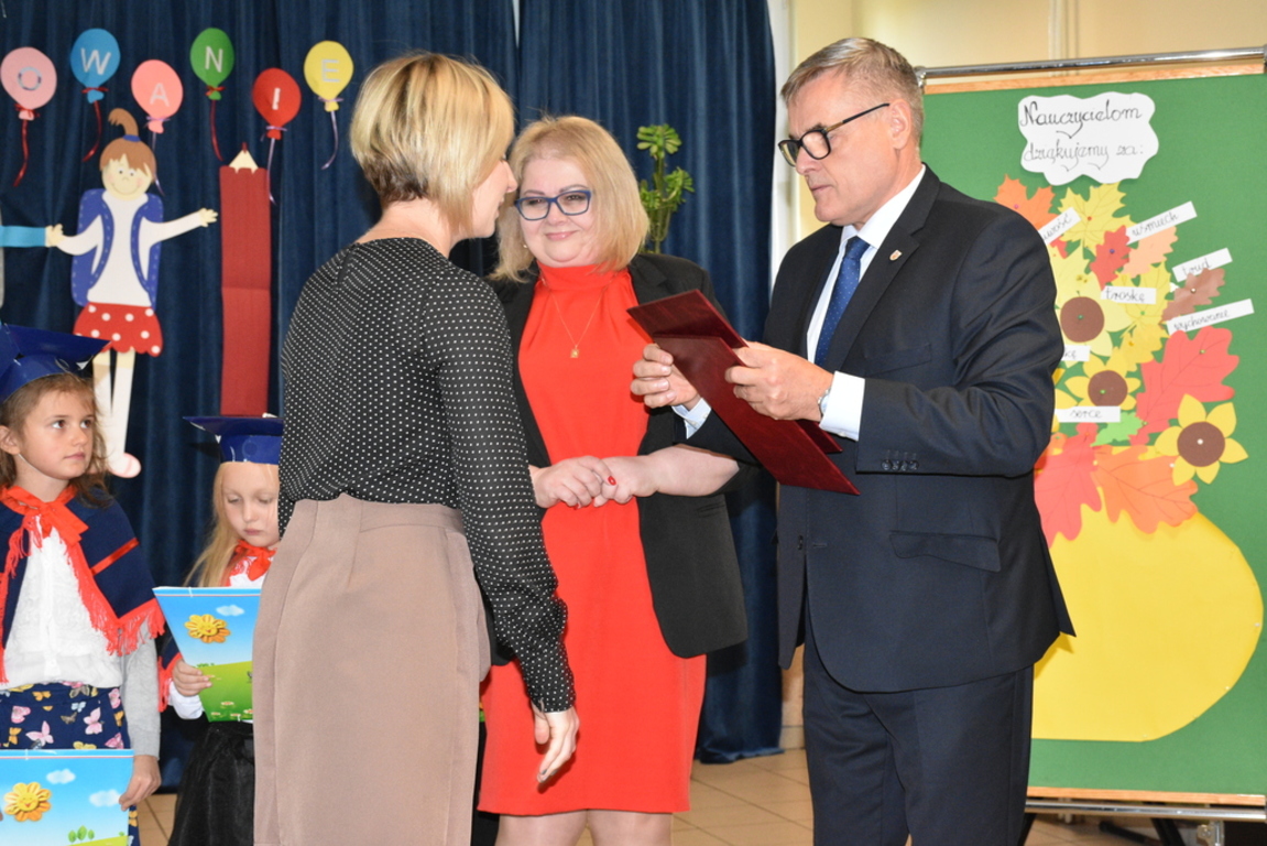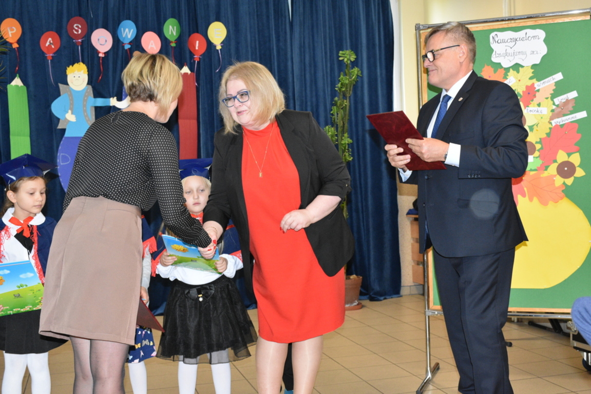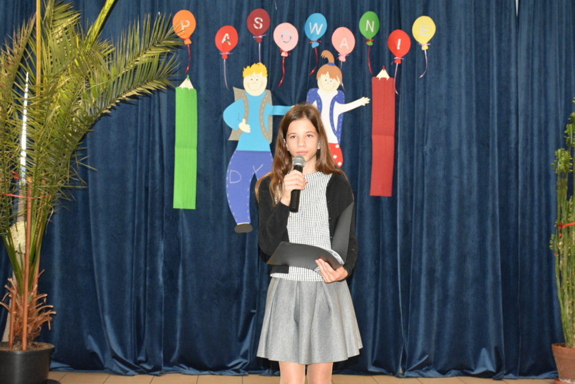 Podczas uroczystej akademii, Pan Lesław Krokosz nagrodził Panią Dyrektor Elżbietę Piżuk oraz wręczył nagrodę Burmistrza Gminy i Miasta Lwówek Śląski dla Pani Marty Gos. Gratulujemy! W tym uroczystym dniu miał też miejsce bogaty program artystyczny z udziałem młodszych uczniów, którzy po tańcach, wesołych piosenkach i specjalnym teście, otrzymali zgodę publiczności na ślubowanie i pasowanie na pierwszoklasistów. Na koniec głos zabrał radny Mateusz Rusinek.