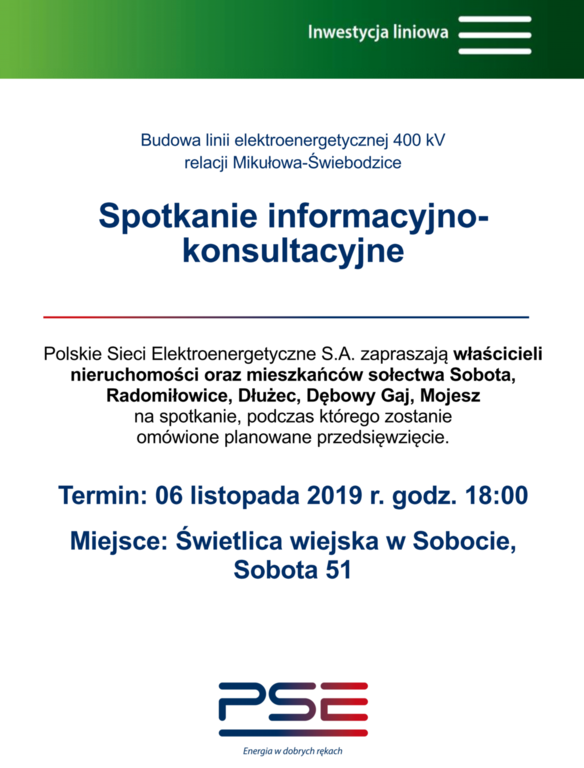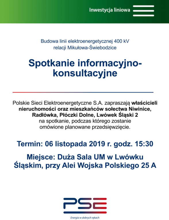 Polskie Sieci Elektroenergetyczne S.A. zapraszają na spotkanie informacyjno- konsultacyjne pn. Budowa linii elektroenergetycznej 400 kV relacji Mikułowa-Świebodzice, podczas którego zostanie omówione planowane przedsięwzięcie.