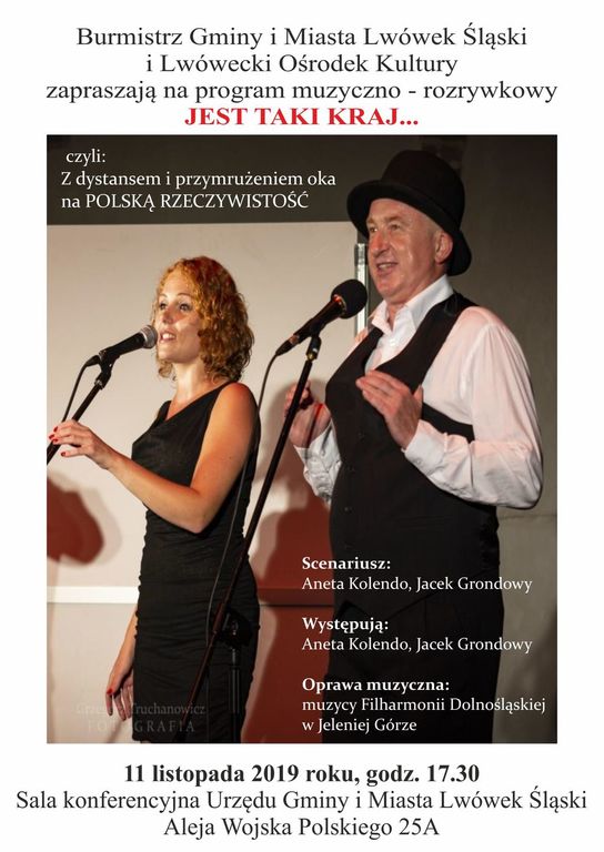 Lwóweckie obchody Święta Odzyskania Niepodległości zwieńczy program muzyczno-rozrywkowy pt. "Jest taki Kraj...". 11 listopada br. o godz. 17.30 w Sali Konferencyjnej Urzędu Gminy i Miasta w Lwówku Śląskim: