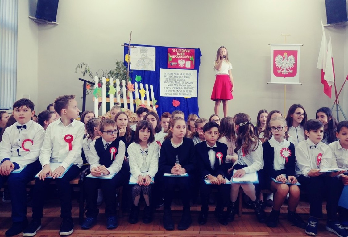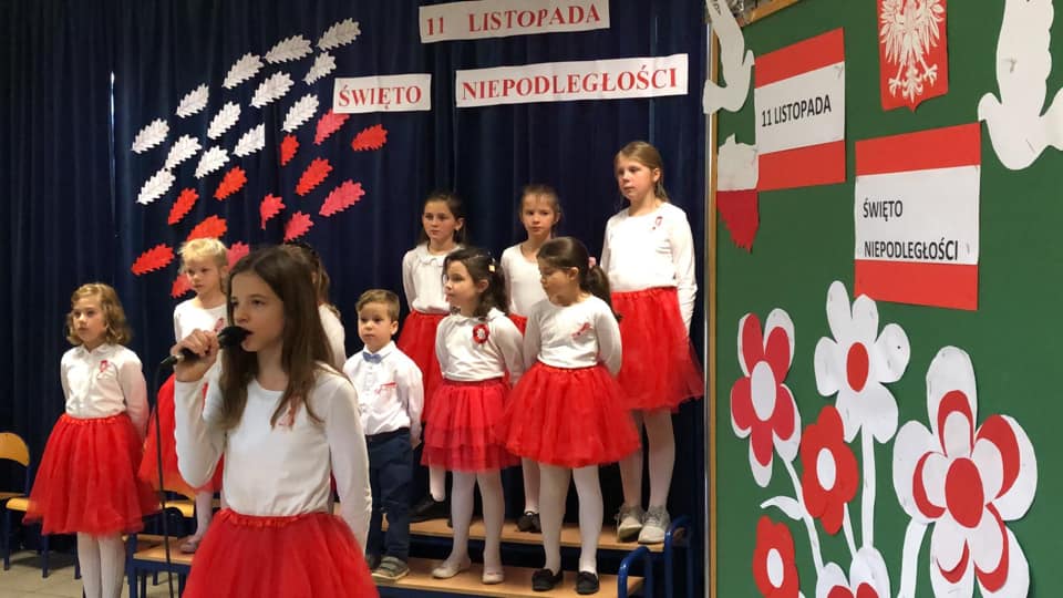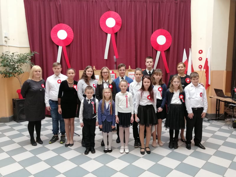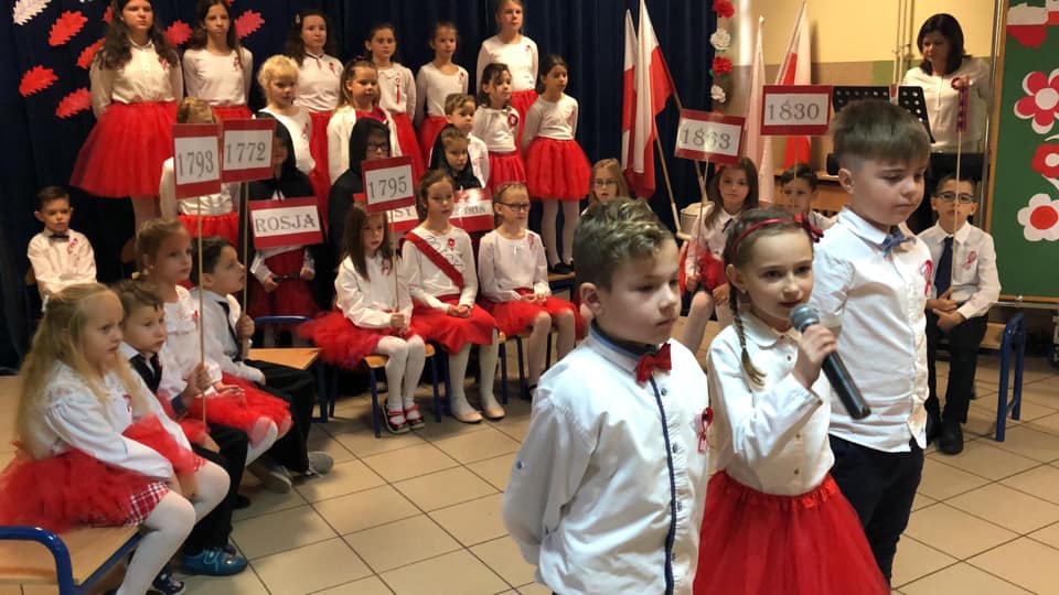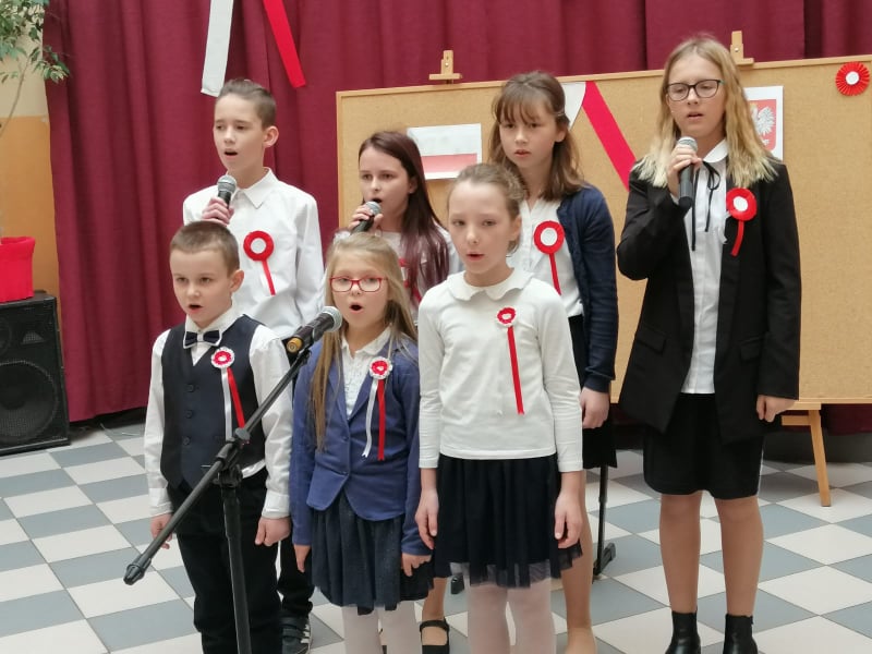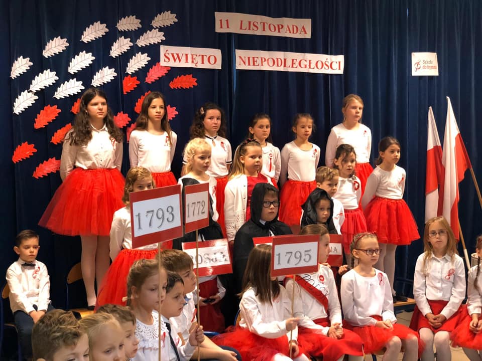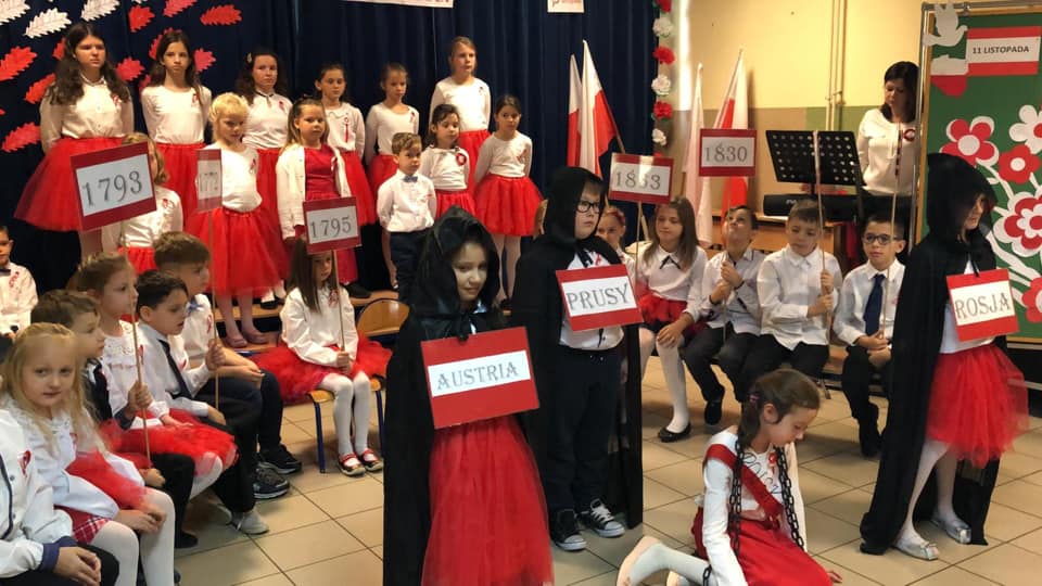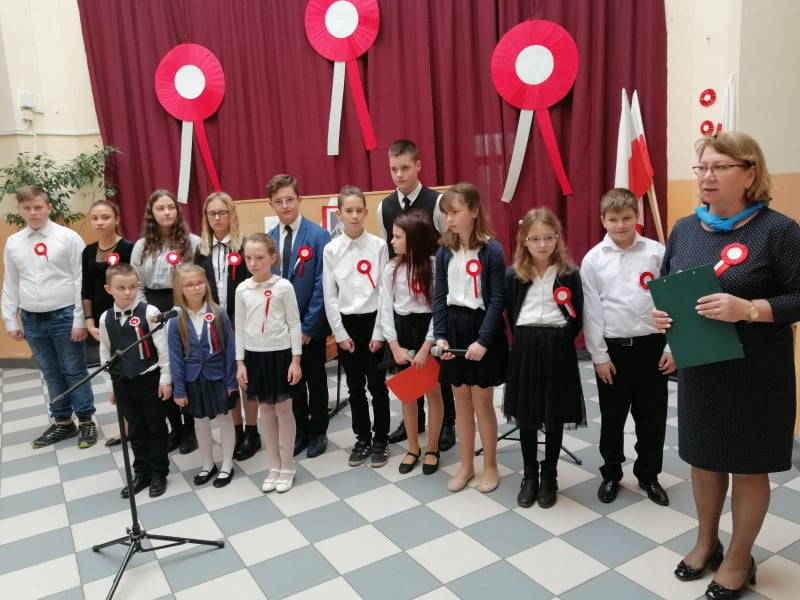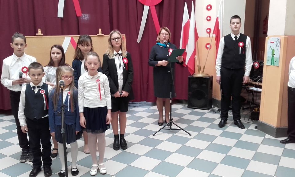 SZKOŁA PODSTAWOWA NR 1. W czwartek 7 listopada br. na 3, 4 i 5 lekcji dzieci z oddziałów przedszkolnych oraz wszyscy uczniowie obejrzeli montaż słowno-muzyczny poświęcony rocznicy odzyskania niepodległości przez Polskę 11 listopada 1918 roku. Przedstawienie w auli zaprezentowali uczniowie klas 7 i 8 pod kierunkiem p. B. Kopij-Działy. Z kolei zespół muzyczny JP2, prowadzony przez p. Urszulę Graczyk, zaśpiewał znane pieśni patriotyczne. Program obejrzeli też nauczyciele oraz pozostali pracownicy szkoły.