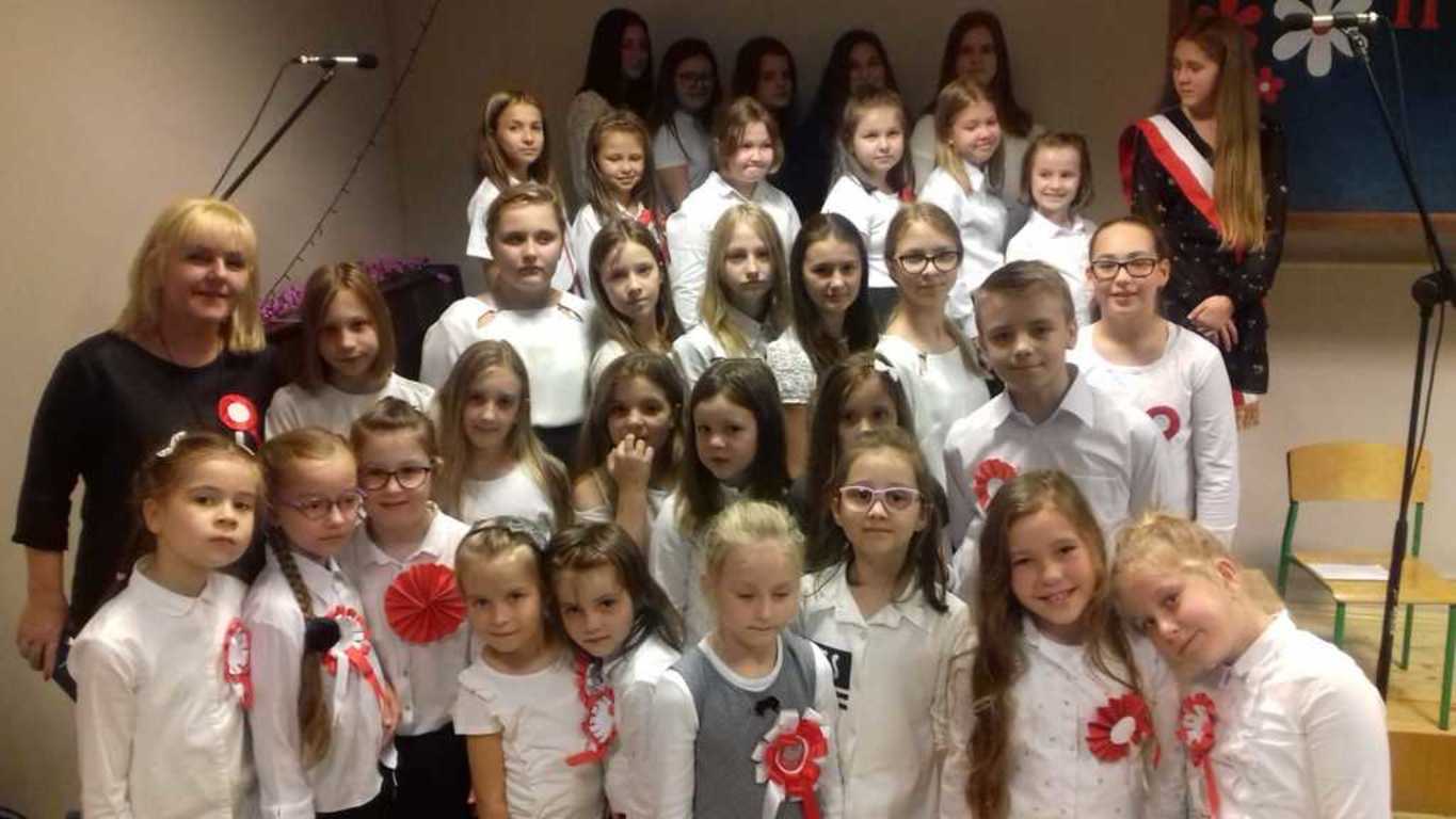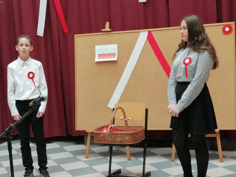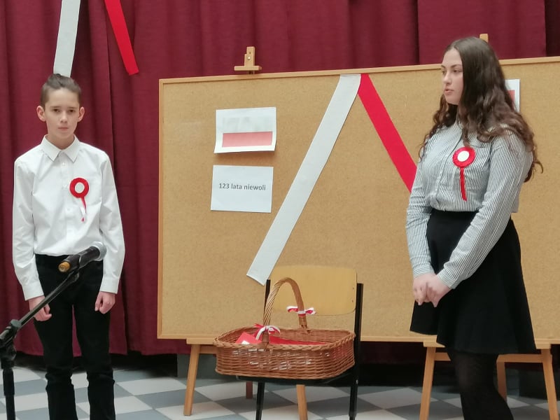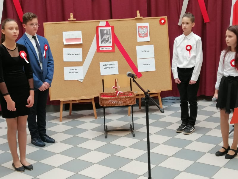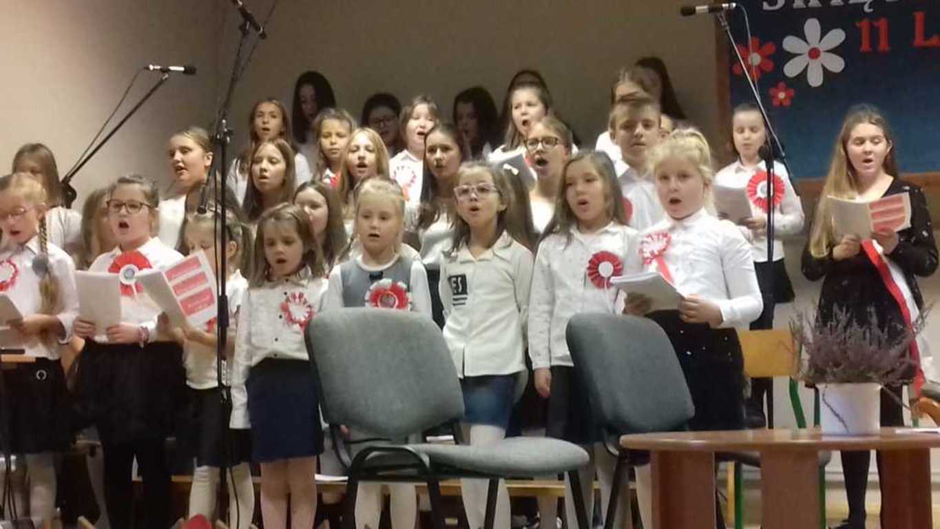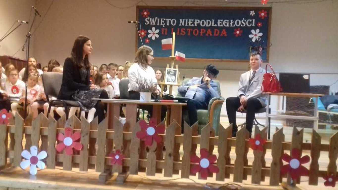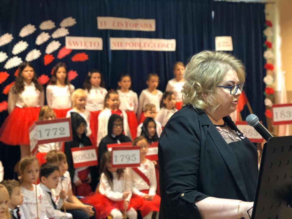 SZKOŁA PODSTAWOWA NR 1. W czwartek 7 listopada br. na 3, 4 i 5 lekcji dzieci z oddziałów przedszkolnych oraz wszyscy uczniowie obejrzeli montaż słowno-muzyczny poświęcony rocznicy odzyskania niepodległości przez Polskę 11 listopada 1918 roku. Przedstawienie w auli zaprezentowali uczniowie klas 7 i 8 pod kierunkiem p. B. Kopij-Działy. Z kolei zespół muzyczny JP2, prowadzony przez p. Urszulę Graczyk, zaśpiewał znane pieśni patriotyczne. Program obejrzeli też nauczyciele oraz pozostali pracownicy szkoły.