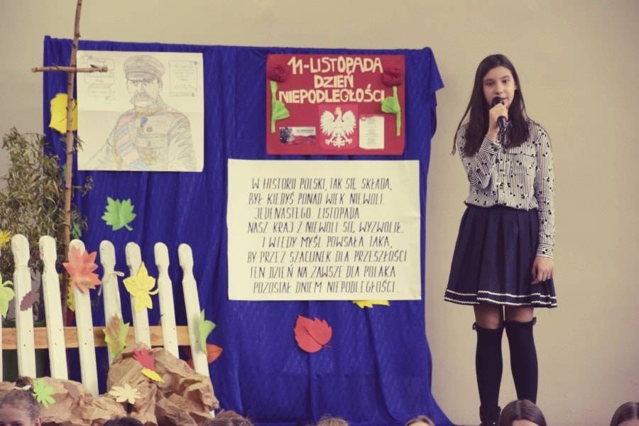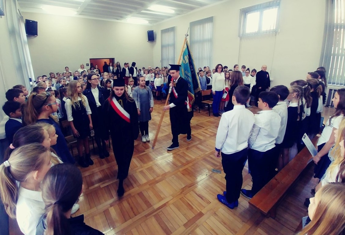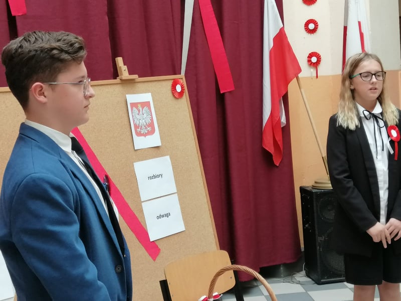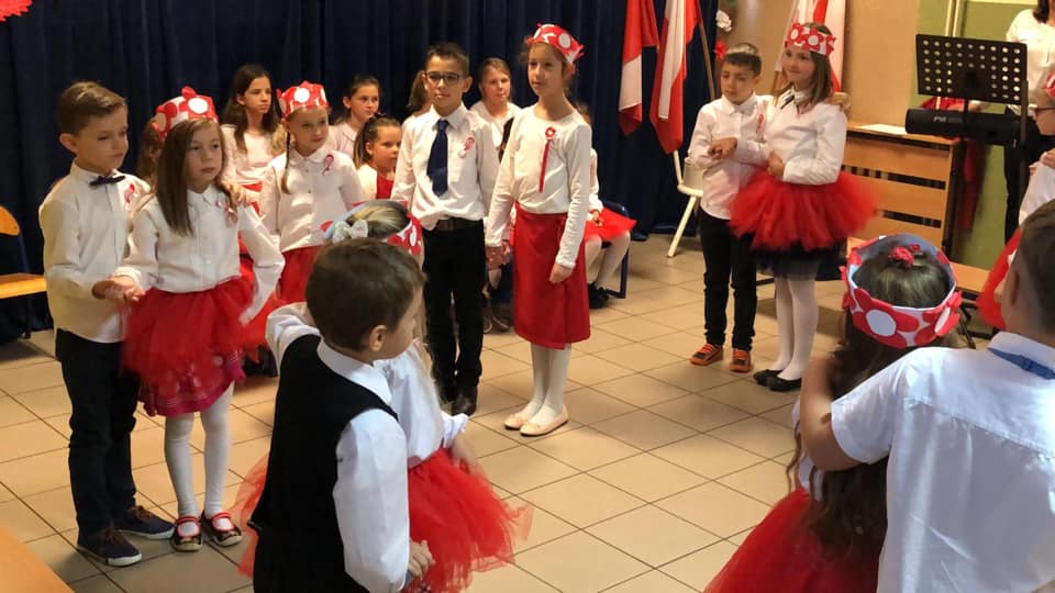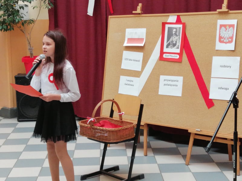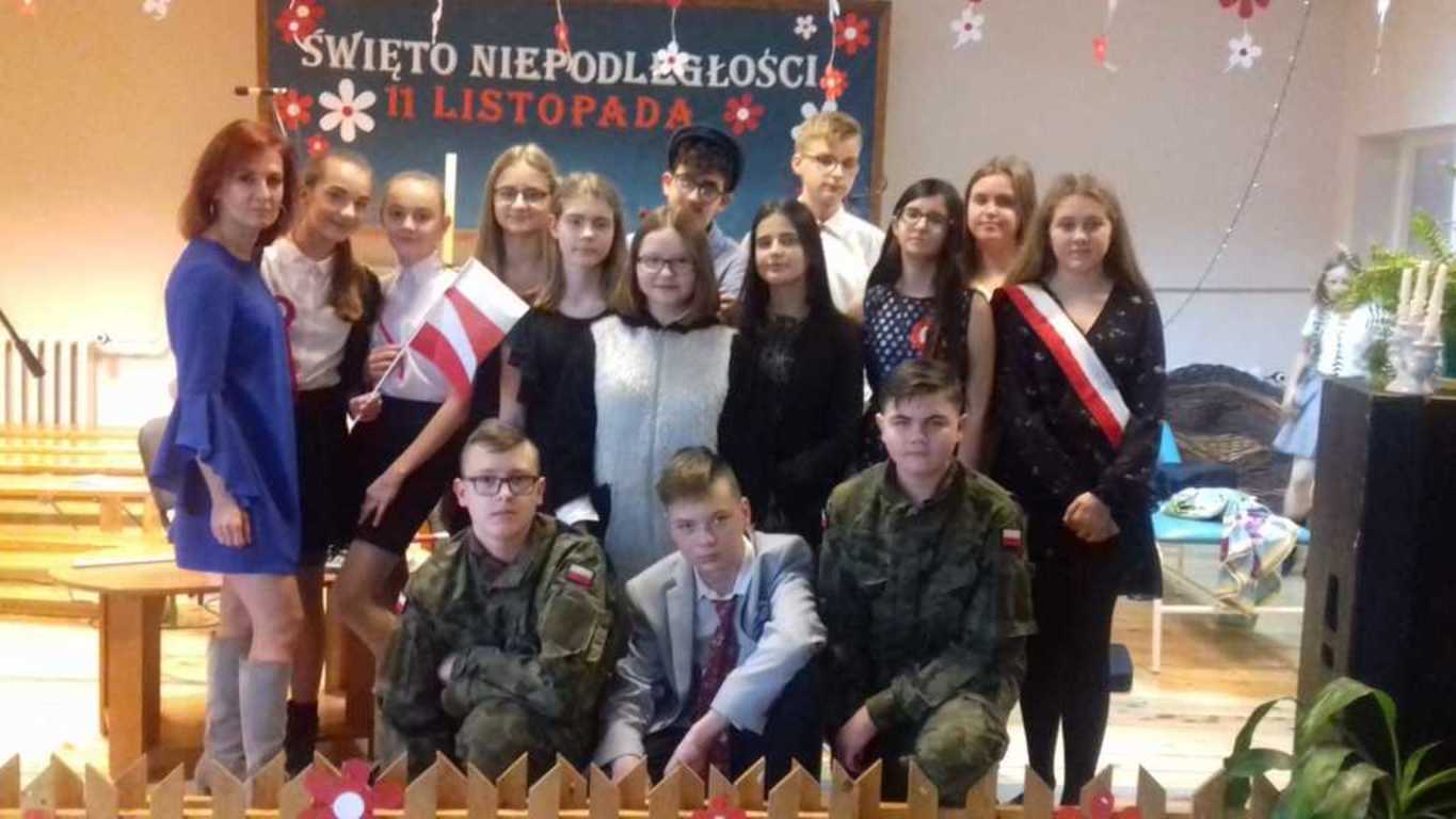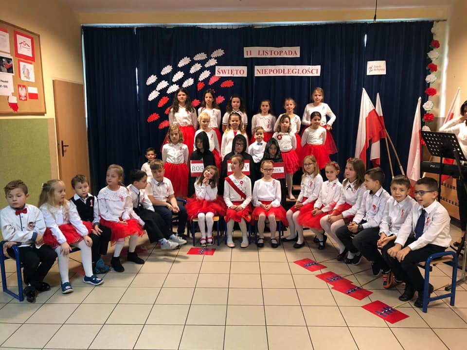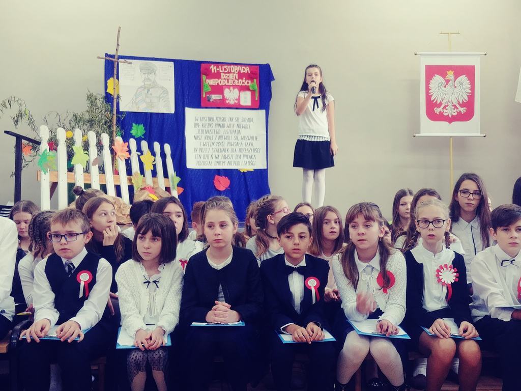 SZKOŁA PODSTAWOWA NR 1. W czwartek 7 listopada br. na 3, 4 i 5 lekcji dzieci z oddziałów przedszkolnych oraz wszyscy uczniowie obejrzeli montaż słowno-muzyczny poświęcony rocznicy odzyskania niepodległości przez Polskę 11 listopada 1918 roku. Przedstawienie w auli zaprezentowali uczniowie klas 7 i 8 pod kierunkiem p. B. Kopij-Działy. Z kolei zespół muzyczny JP2, prowadzony przez p. Urszulę Graczyk, zaśpiewał znane pieśni patriotyczne. Program obejrzeli też nauczyciele oraz pozostali pracownicy szkoły.