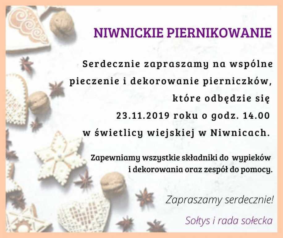 Sołtys i rada sołecka serdecznie zapraszają na wspólne pieczenie i dekorowanie pierniczków, które odbędzie się 23 listopada br. w świetlicy wiejskiej w Niwnicach. Organizatorzy zapewniają wszystkie sładniki oraz zespół do pomocy.