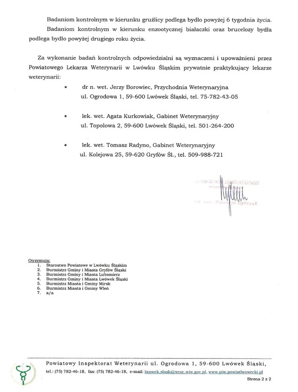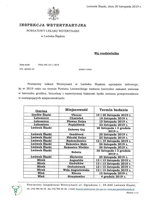 Powiatowy Lekarz Weterynarii w Lwówku Śl. uprzejmie informuje, że w 2019 r. na terenie powiatu lwóweckiego badania kontrolne zakażeń zwierząt w kierunku gruźlicy, brucelozy i enzootycznej białaczki bydła zostaną przeprowadzone w kilkunastu miejscowościach (w zał.).