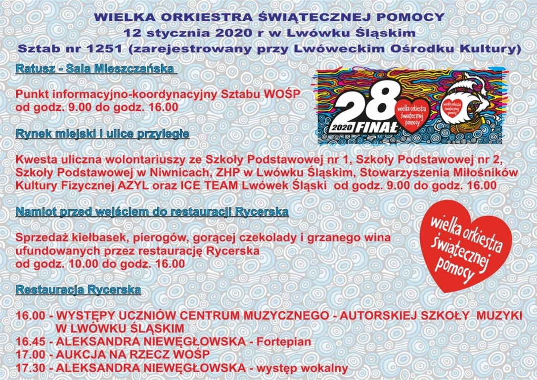 Z kolei od godziny 16.00 warto przyjść do "Rycerskiej", by jeszcze inaczej wspomóc WOŚP oraz posłuchać dzieci z Centrum Muzycznego - Autorskiej Szkoły Muzyki w Lwówku Śląskim. O 16.45 zaprezentuje się Ola Niewęgłowska, która zagra na pianinie, a następnie zaprezentuje swój kolejny, tym razem wokalny talent. Nie zapomnijcie o aukcji na rzecz WOŚP, będzie o godz. 17.00. Siema!