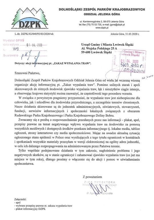Mając na uwadze dbałość o wspólne środowisko naturalne i zmiany w nim zachodzące zwracamy się z prośbą do wszystkich jednostek administracyjnych i oświatowych na Dolnym Śląsku o przyłączenie się do akcji informacyjnej i rozpropagowanie materiałów na temat zakazu wypalania traw w mediach lokalnych, na stronach internetowych i tablicach ogłoszeń. Odnośnie aktualnej sytuacji ogłoszonego stanu epidemii w Polsce oraz wynikających z tego tytułu ograniczeń w kontaktach apelujemy o jak największe rozpropagowanie tegorocznej akcji (bo pierwsze pożary miały już miejsce) w formie elektronicznej z możliwością dotarcia do różnych lokalnych grup społecznych.