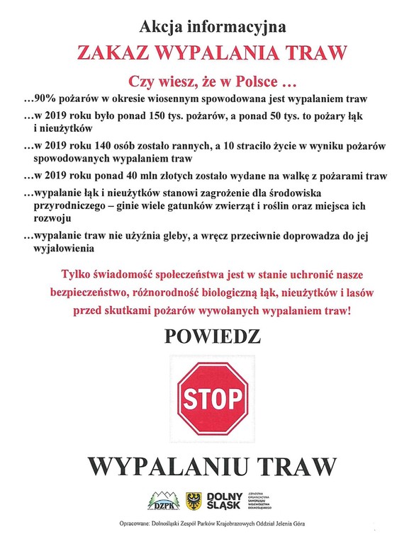 W trosce o ochronę przyrody Dolnośląski Zespół Parków Krajobrazowych od wielu lat wczesną wiosną organizuje na terenie województwa dolnośląskiego akcję informacyjną pt. „Zakaz wypalania traw”. Informujemy, przypominamy i apelujemy, że wypalanie traw, łąk i nieużytków rolnych, a szczególnie na terenach chronionych, jest nielegalne, szkodliwe dla środowiska przyrodniczego oraz stanowi zagrożenie dla mienia i życia ludzkiego.