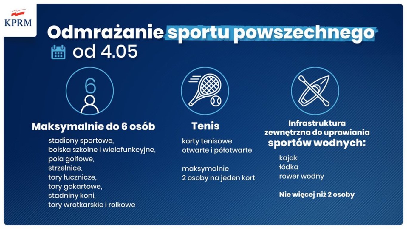Od 4 maja będzie można korzystać z infrastruktury sportowej o charakterze otwartym. Minister sportu przedstawiła kolejne etapy przywracania aktywności sportowej w naszym kraju. Dla maksymalnie sześciu osób korzystających na danym obiekcie, zostaną udostępnione: stadiony sportowe (piłkarskie, lekkoatletyczne i inne), boiska wielofunkcyjne (w tym Orliki), infrastruktura zewnętrzna do uprawiania sportów motorowych oraz lotnictwa, pola golfowe, stadniny koni oraz otwarte obiekty takie jak: strzelnice, tory łucznicze, tory gokartowe, tory wrotkarskie i rolkowe. Możliwe będzie korzystanie z infrastruktury otwartej do uprawiania sportów wodnych. Z jednej łódki, roweru wodnego czy kajaka będą mogły korzystać jednocześnie dwie osoby. W przypadku kortów tenisowych, zostaną udostępnione obiekty otwarte i półotwarte. Będzie obowiązywał limit czterech osób na kort.