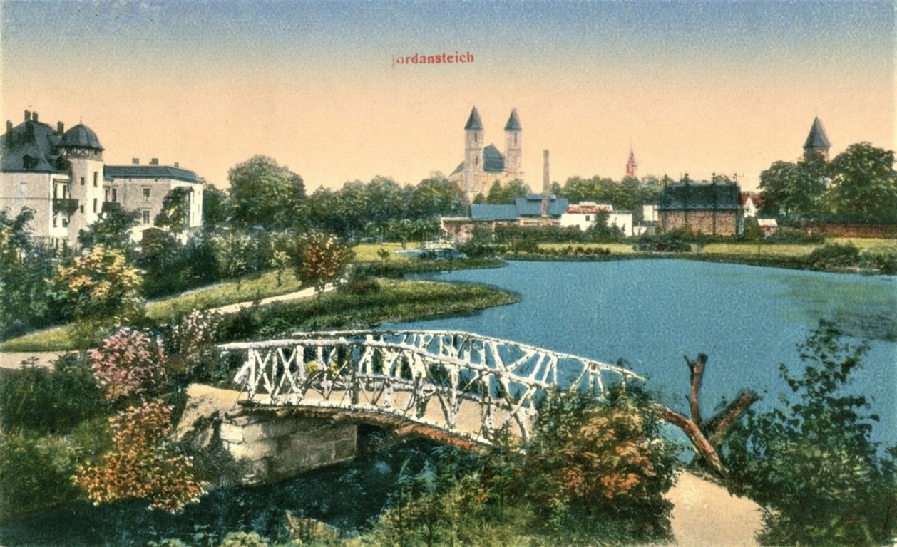 Na początku XX wieku łąkę i staw zaadaptowano do nowych potrzeb mieszkańców. Jako, iż aleje na plantach położonych wzdłuż dawnych murów obronnych z czasem przestały wystarczać, stąd obok promenad powstał Park Jordanowski. O jego przedwojennej nazwie przypominają dawne pocztówki, na których znajdziemy podobnie określenia, jak: Jordanteich; Partie am Jordanteich; In den Jordananlagen; In den Anlagen am Jordanteich. Nad ciekiem wodnym z dwóch stron stawu przerzucono dwie drewniane kładki, ustawiono kilka głazów pamiątkowych, posadzono krzewy i drzewa, zainstalowano pomnik wojenny (ob. placyk zwany "rondem"), a także wykonano mały kopiec, na którego środku zainstalowano drewniane poręcze oraz siedziska z małym zadaszeniem (po wojnie tzw. "patelnia" z metalowymi barierkami). Z czasem też wykopano drugi zbiornik, zmieniając położenie jednej z kładek.