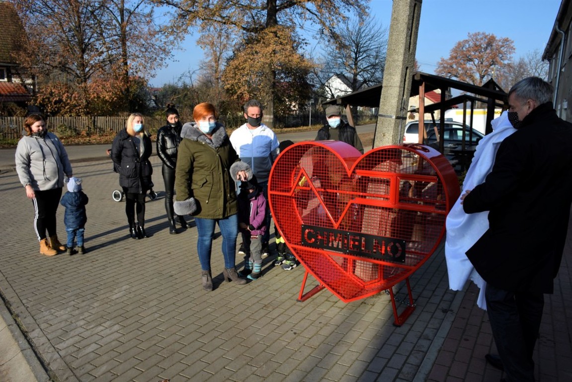 Nie od dziś wiadomo, że w tej podlwóweckiej wsi jest wielu wspaniałych mieszkańców. Od lat poświęcają swój czas dla innych, organizując imprezy, akcje charytatywne oraz szereg innych działań. Środa 2 grudnia 2020 roku zostanie zapamiętana, jako dzień w którym obok świetlicy w Chmielnie odsłonięto piękne serce na nakrętki plastikowe - pierwsze takie w Gminie Lwówek Śląski. Z zaproszenia do odsłonięcia "sercowego pojemnika" skorzystał z przyjemnością Pan Wiceburmistrz Lesław Krokosz. Pomysłodawcą inwestycji jest Pani Sołtys Agnieszka Karaban, natomiast całym zamówieniem i realizacją zajęła się członkini Rady Sołeckiej Wioletta Świetlicka. Swoją cegiełkę dołożyły też inne osoby, co napawa nas dumą i radością: