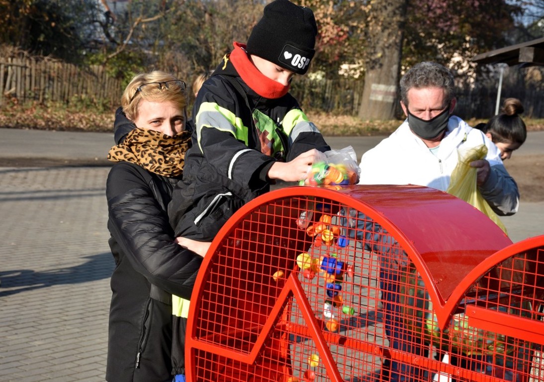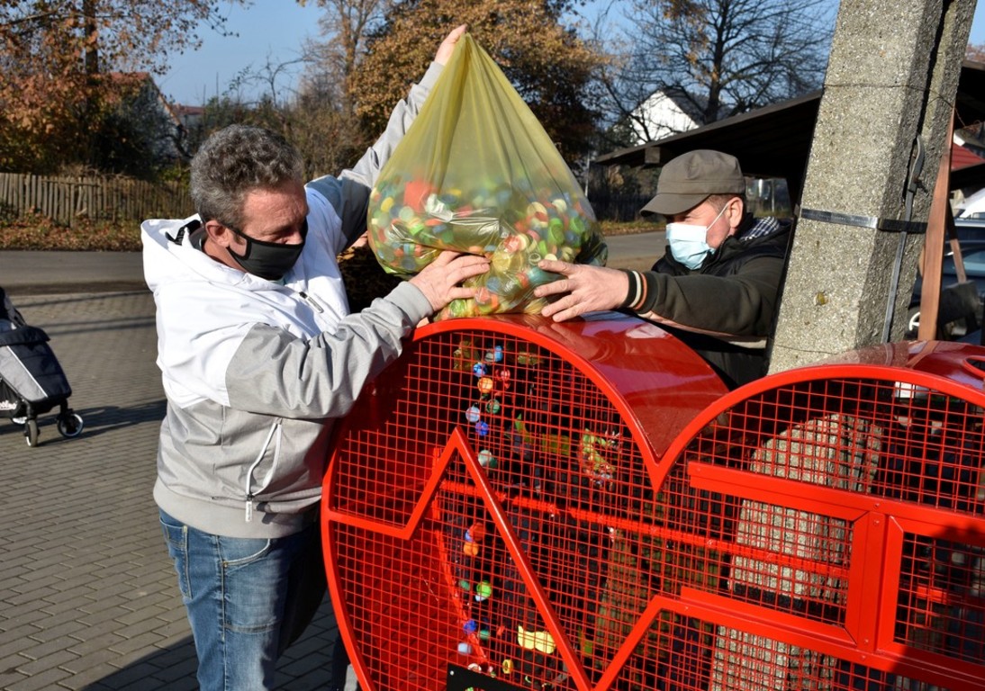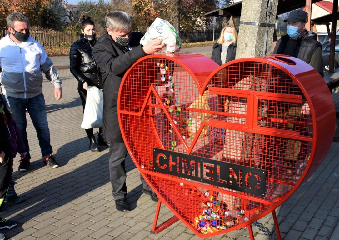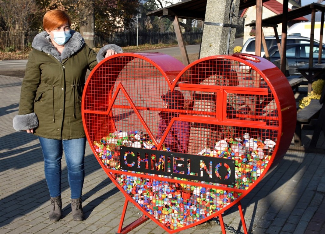 Po zebraniu potrzebnej kwoty zakupiono piękne serce, które stanęło na placu w centrum Chmielna, aby każdy mieszkaniec mógł łatwo wrzucić do środka kolorowe nakrętki. Zakup ten nie tylko propaguje ekologię, ucząc i przypominając o konieczności segregacji śmieci i zarazem zmniejsza ilość rozrzucanych nakrętek w okolicy. Ważne jest również to, iż po napełnieniu takiego serca można pomóc choremu dziecku w zakupie potrzebnego sprzętu, np. wózka inwalidzkiego.
