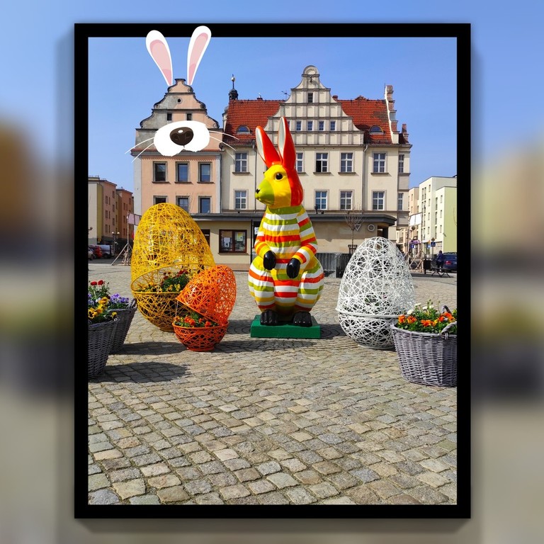 Piękna pogoda, wielkanocny klimat... Tylko pamiętajmy o zachowaniu dystansu i szanujmy nasze wspólne ozdoby. Stajemy do zdjęć obok zająca, jajek i koszy z kwiatami.