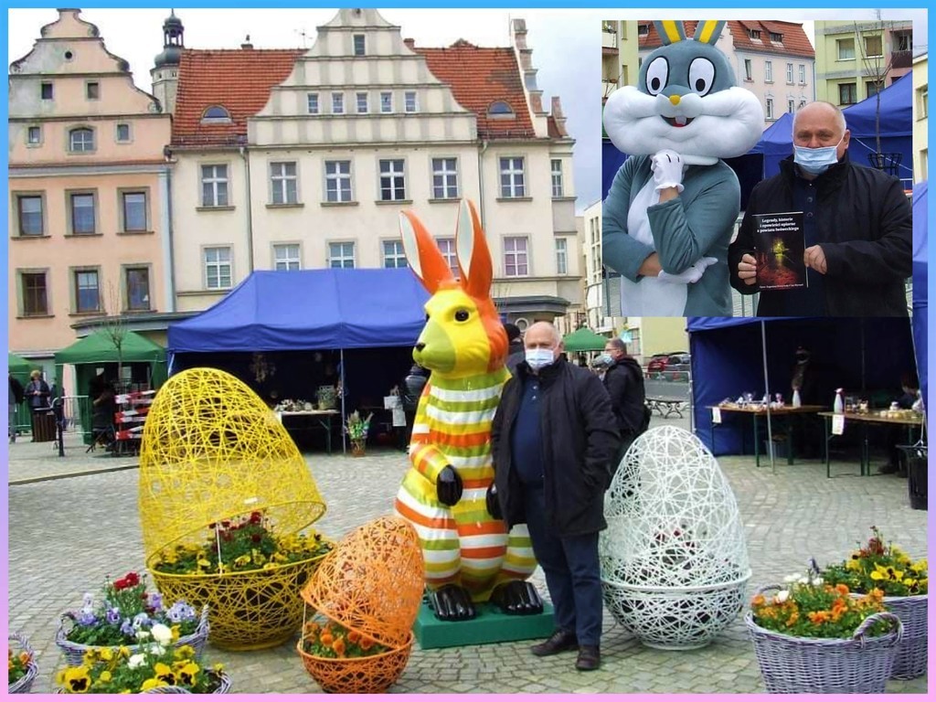 Wesołe zające krążyły wokół targowiska na placu dolnorynkowym, gdzie sprzedawano potrawy, stroiki i domowe wypieki. Od rana do popołudnia pojawiały się tu i tam z koszykami, by rozdawać kolorowe, czekoladowe jajeczka oraz pozować do pamiątkowych zdjęć. Tak między nami to nie tylko dzieci chciały robic sobie zdjęcia z zającami wielkanocnymi. Jednym z znich był Prezes Towarzystwa Miłośników Gryfowa Śląskiego, który na zdjęciu trzyma własną (współautorską) książkę o legendach powiatu lwóweckiego: