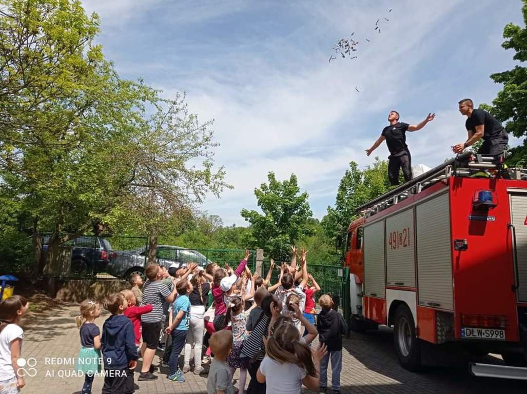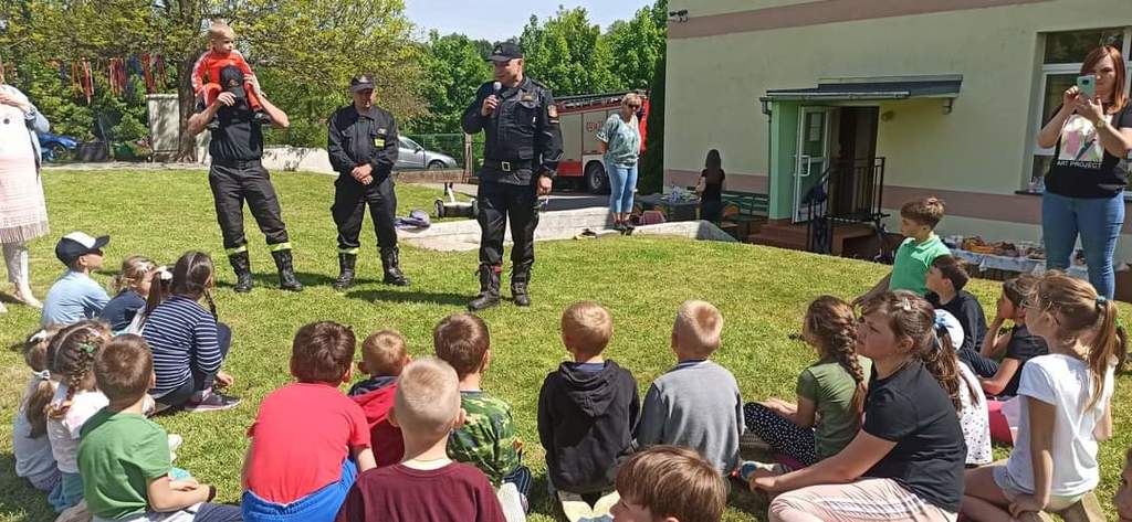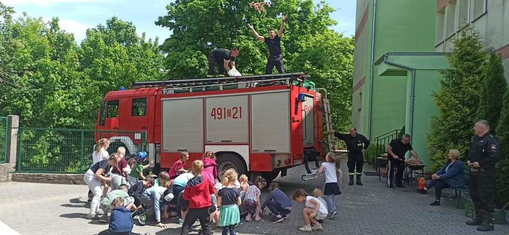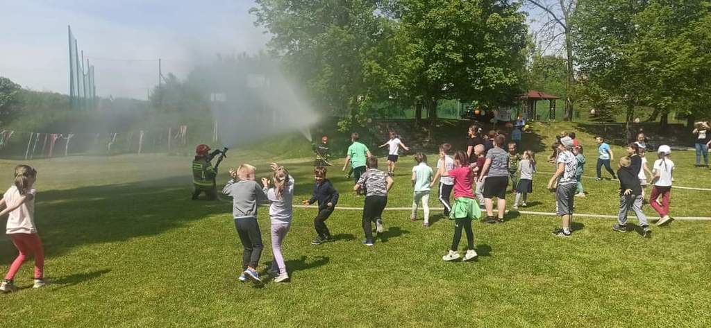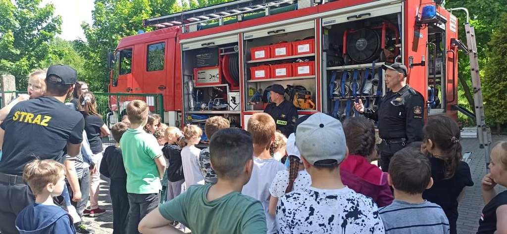 Z kolei strażacy pokazywali dzieciom na czym polega ich praca. Dowódca Jednostki Ratowniczo-Gaśniczej opowiadał, jak powinny się zachowywać podczas zbliżających się wakacji i na co powinny zwracać uwagę na co dzień. Następnie strażacy zademonstrowali uczniom, w jaki sposób przeprowadzają rozwinięcie linii wodnej.
