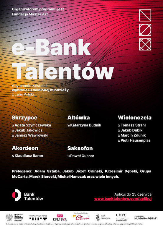 “e-Bank Talentów 2021” jest to pionierski projekt skierowany do najzdolniejszych młodych artystów od 13 do 22 roku życia z całej Polski.