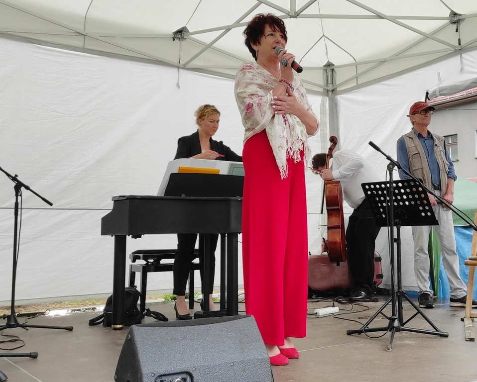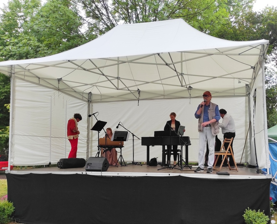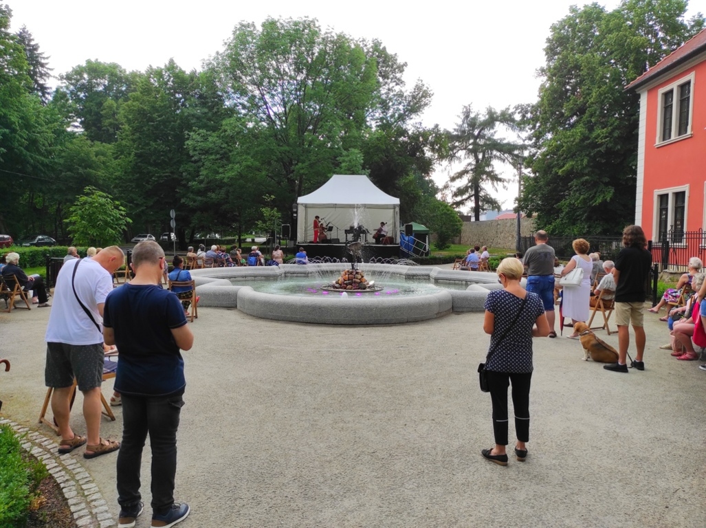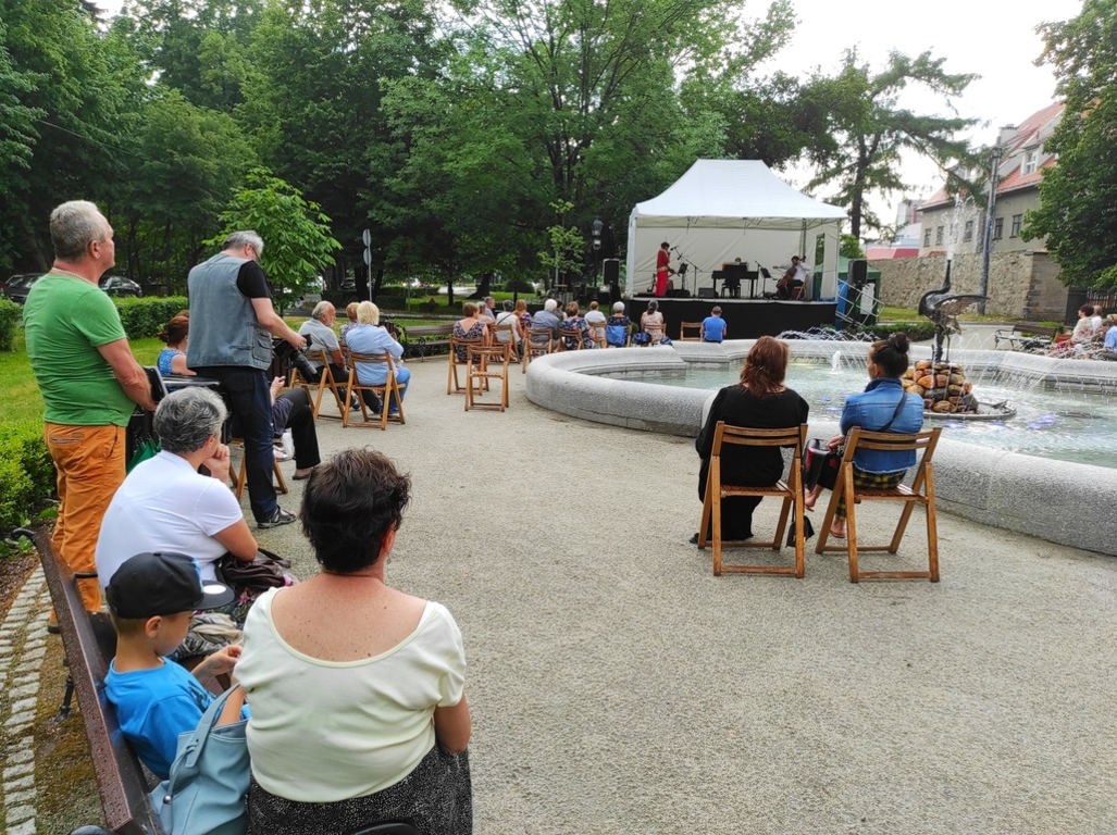 W poniedziałek 20 czerwca br., mimo nienajlepszej aury, która odstraszyła wielu chętnych, udało się zorganizować koncert przy Fontannie z Czaplą. Na szczęście deszcz przestał padać tuż przed tym, jak na scenie pojawił się Dyrektor Lwóweckiego Ośrodka Kultury. Tadeusz Dzieżyc przypomniał, jakie utwory zostaną zagrane oraz zapowiedział gospodarza Gminy i Miasta Lwówek Śląski. Burmistrz Gminy i Miasta Lwówek Śląski Mariola Szczęsna z radością powitała licznie zgromadzonych. Ponieważ wciąż zmagamy się i odczuwamy skutki epidemii, dlatego zadedykowała koncert wszystkim tym, którzy ucierpieli na skutek Covid-19. Następnie Pani Burmistrz przedstawiła muzyków: Ewę Antosik, Joannę Przybyła, Vitalinę i Romana Samostrokov.