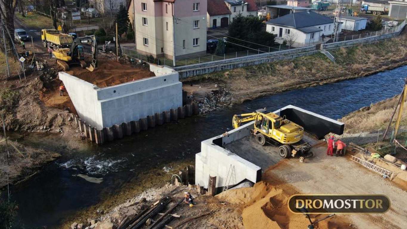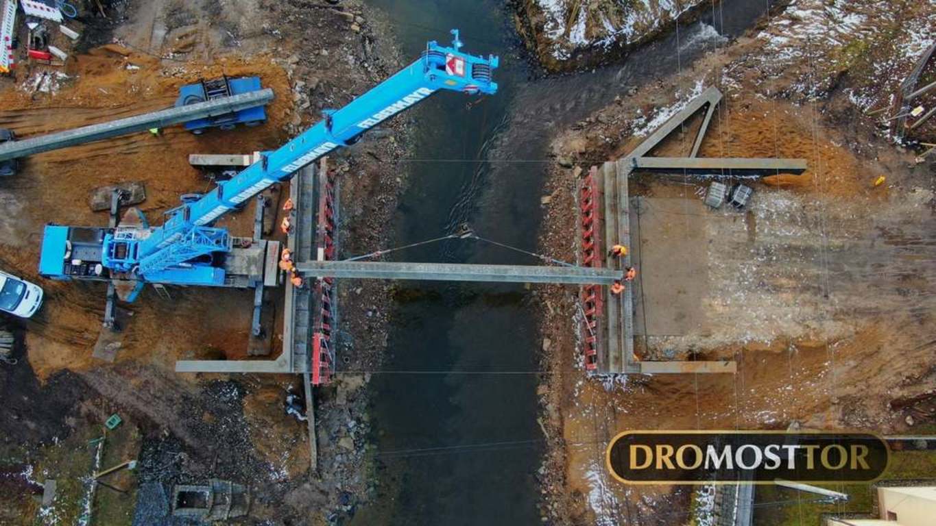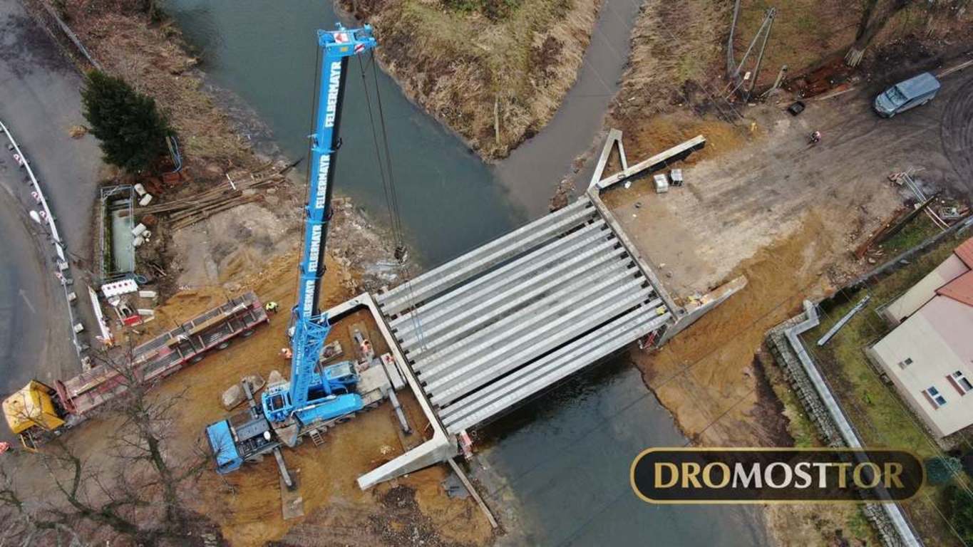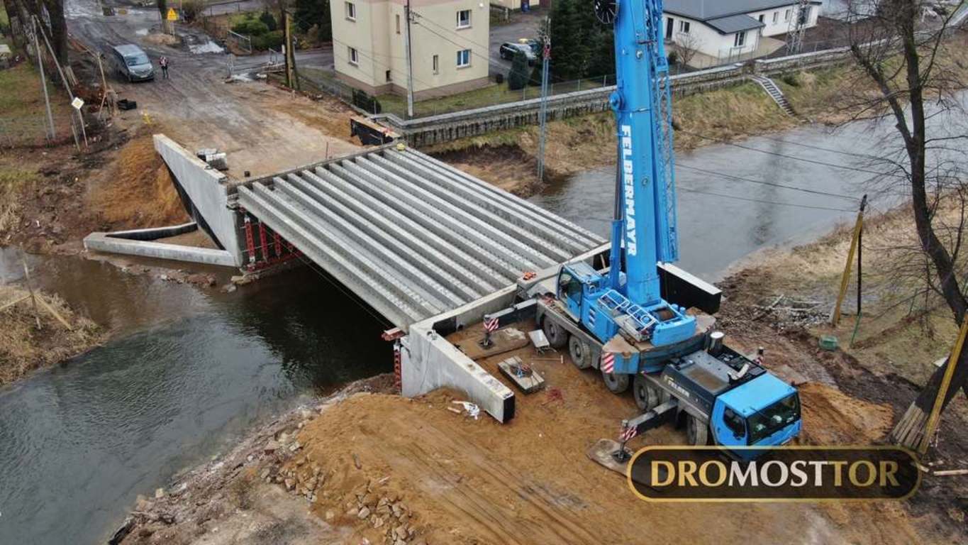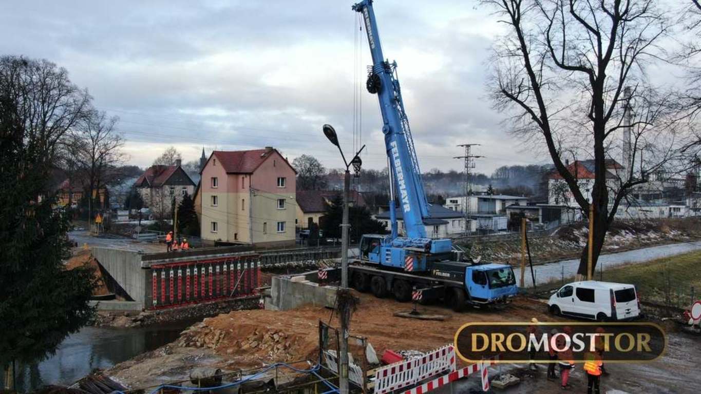 Wpis 3 lutego 2021 r.: 15 ton masy , oraz 18m długości - tyle mierzyła każda z 13 belek przęsłowych zamontowanych dzisiaj we Lwówku Śląskim. Z uwagi na rozpiętość elementów do pracy zaangażowany został 130 tonowy dźwig. Prace przebiegły bez większych komplikacji i już ok. 15.00 mogliśmy się cieszyć z ponownego połączenia obu brzegów Bobru w tym miejscu. Most powstający na DW-364 zastąpi starą, niespełniającą już kryteriów bezpieczeństwa konstrukcję łukową.