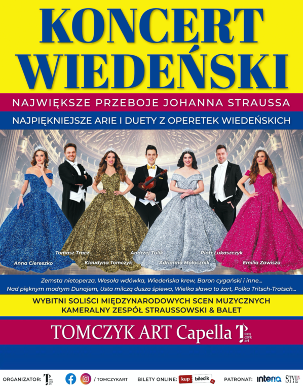 w swoim rodzaju widowisko. Zabrzmią największe, ponadczasowe i wiecznie bliskie sercom melomanów przeboje króla walca - Johanna Straussa, nie zabraknie także popisowych arii z najsłynniejszych operetek "Zemsta nietoperza", "Baron cygański", "Wesoła wdówka", "Księżniczka czardasza" oraz "Kraina uśmiechu". Publiczność usłyszy m.in.: Walc "Nad pięknym modrym Dunajem", Arię Barinkaya "Wielka sława to żart", Duet wszech czasów "Usta milczą dusza śpiewa", polkę "Tritsch- Tratsch" oraz słynny "Marsz Radeckiego". W klimat magicznych bali wiedeńskich wprawią Państwa olśniewające kreacje artystów, przepiękne suknie balowe solistek oraz Straussowskiej Orkiestry Kameralnej wykonującej to niezwykłe widowisko. Koncert programowo nawiązywać będzie do tradycyjnych gali i noworocznych koncertów, odbywających się w Wiedniu.