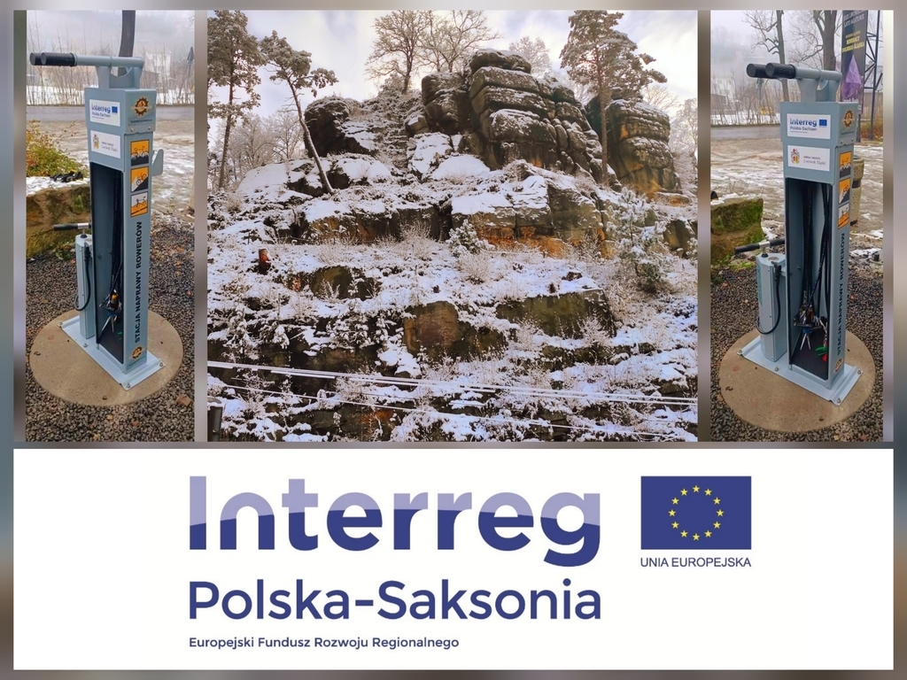 Stacja naprawy rowerów została zakupiona w ramach projektu „Odkryj skarby geologiczne Górnych Łużyc i Dolnego Śląska!”. Projekt współfinansowany jest ze środków Europejskiego Funduszu Rozwoju Regionalnego w ramach Programu Interreg Polska – Saksonia 2014-2020.