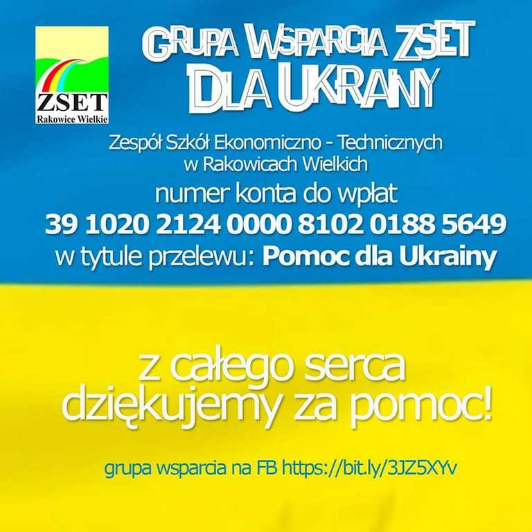 - Od 2015 r. w ZSET w Rakowicach Wielkich uczy się i przebywa młodzież pochodząca z Ukrainy. Obecnie jest to grupa 55 osób w wieku od 14 lat. W związku z bardzo trudną sytuacją ludności cywilnej na Ukrainie podejmujemy jako szkoła pilne działania mogące ułatwić im przetrwanie tego trudnego okresu. Ponadto nie wszystkim naszym uczniom udało się po feriach do nas wrócić. Ci, którzy są wśród nas przeżywają koszmar rozstania z rodziną, strachu i niepewności. Ze wszystkich sił staramy się ich wspierać, jednak wszyscy zdajemy sobie sprawę, że słowa otuchy to zdecydowanie za mało. Czas na organizację realnej pomocy. W większości uczniowie Ci mają zablokowane konta bankowe, dlatego podejmujemy pilne działania umożliwiające im dalszy pobyt w bezpiecznych warunkach. Kochani, czas na organizację realnej pomocy naszym uczniom z Ukrainy i ich rodzinom w związku z wojną, która objęła całą Ukrainę. Spodziewamy się w najbliższych dniach przyjazdu uchodźców uciekających z obszarów objętych działaniami zbrojnymi. Dla nich, wspólnie z organem prowadzącym - starostwem powiatowym, organizujemy wsparcie przygotowując miejsca w naszym internacie - informuje