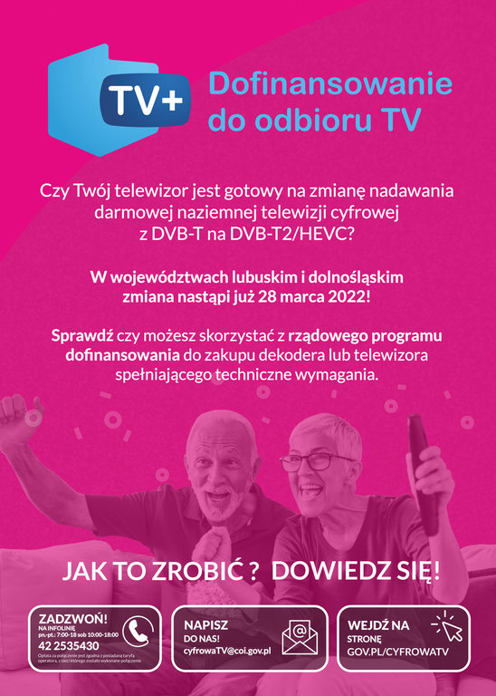 Więcej informacji znajdziesz na:www.gov.pl/CyfrowaTVlub dzwoniąc pod numer 42 253 54 30