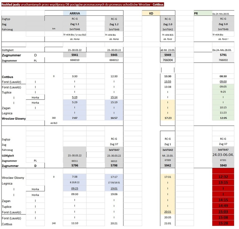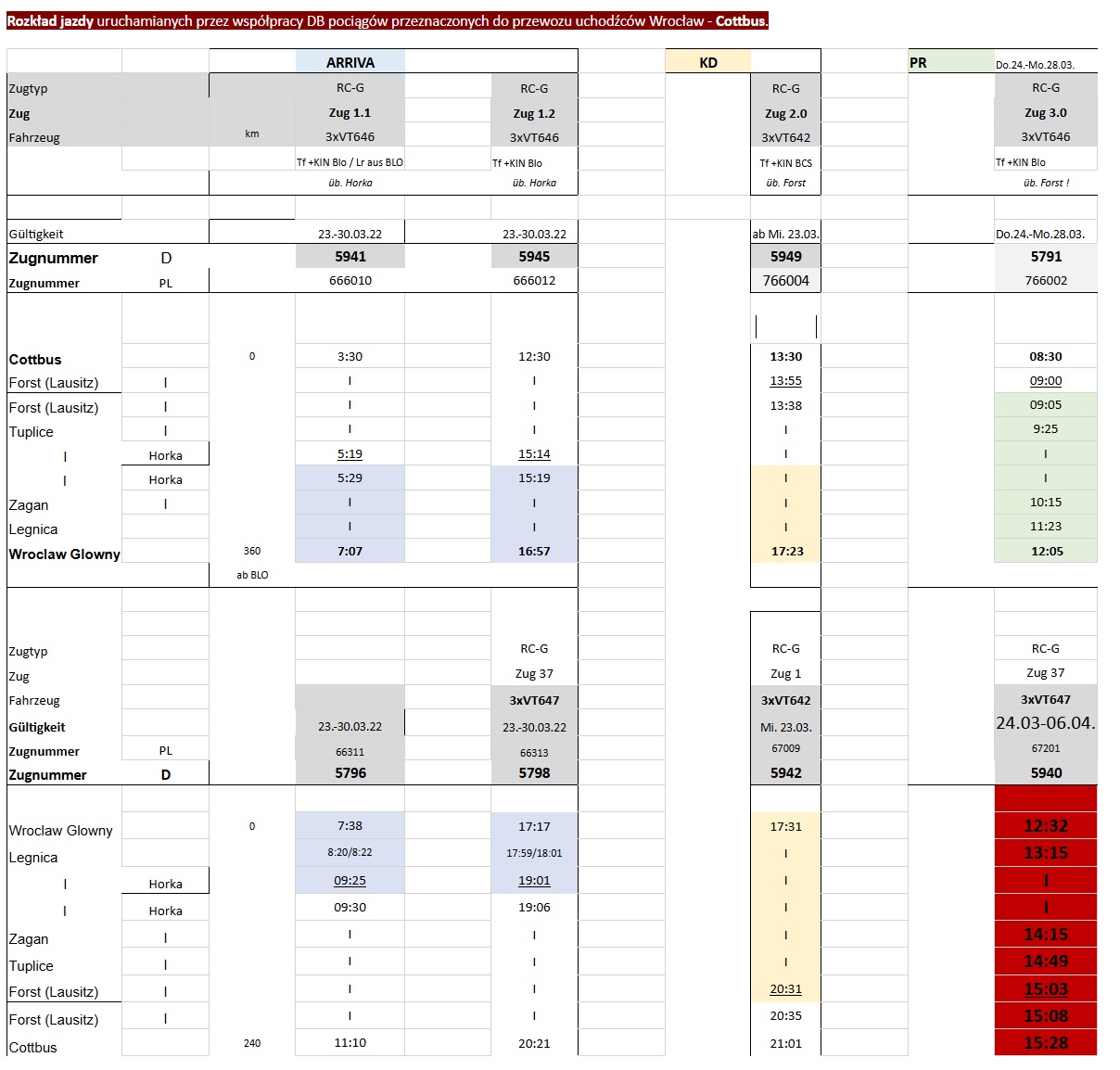 Rozkład jazdy uruchamianych przez współpracy DB pociągów przeznaczonych do przewozu uchodźców Wrocław - Cottbus.
