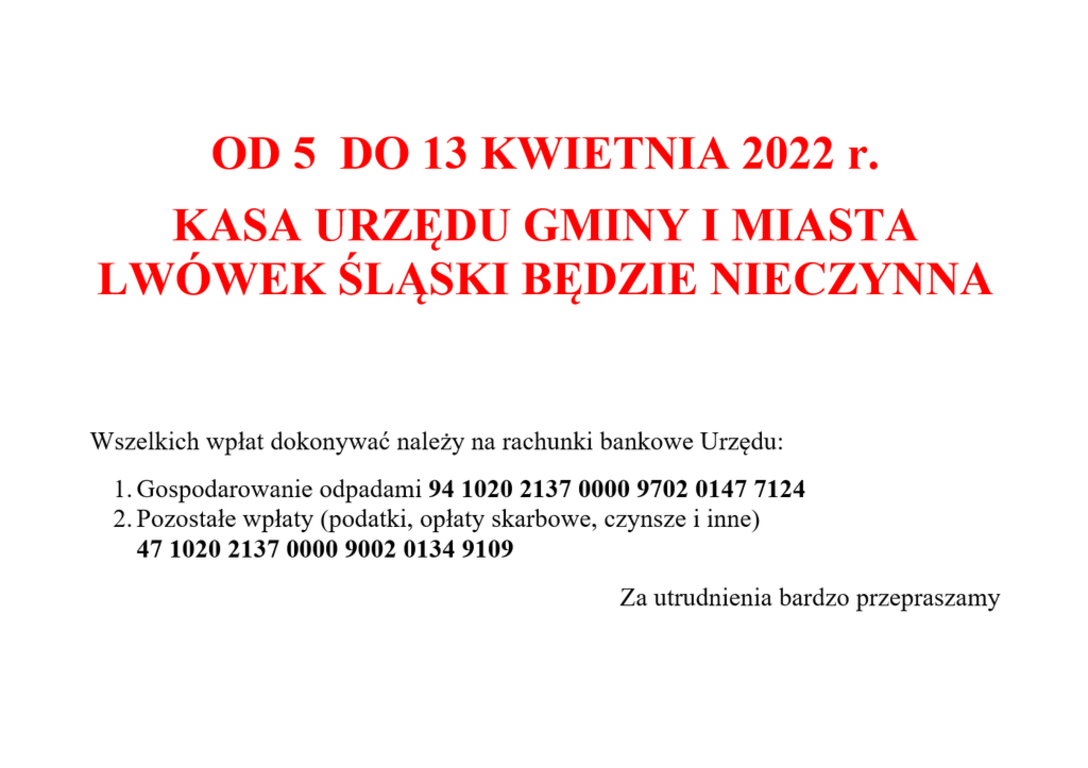 KASA URZĘDU GMINY I MIASTA LWÓWEK ŚLĄSKI BĘDZIE NIECZYNNA