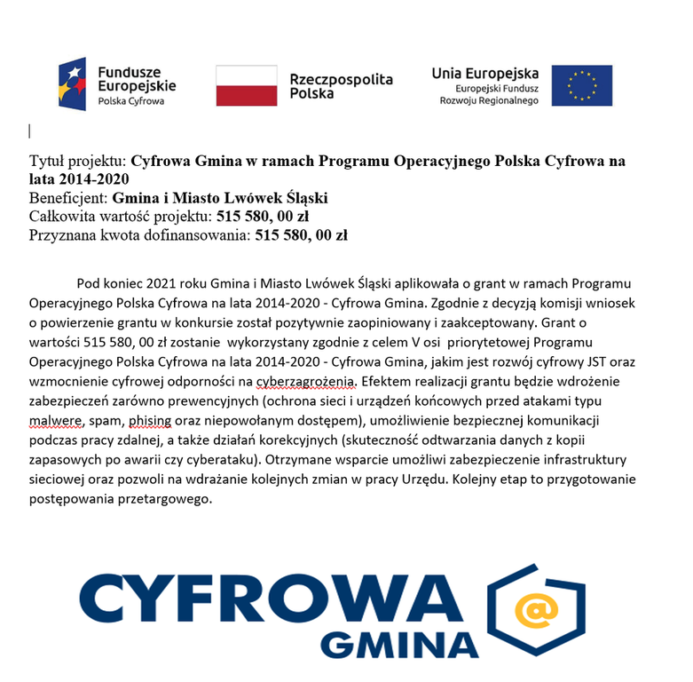 Pod koniec 2021 roku Gmina i Miasto Lwówek Śląski aplikowała o grant w ramach Programu Operacyjnego Polska Cyfrowa na lata 2014-2020 - Cyfrowa Gmina. Zgodnie z decyzją komisji wniosek o powierzenie grantu w konkursie został pozytywnie zaopiniowany i zaakceptowany. Grant o wartości 515 580, 00 zł zostanie wykorzystany zgodnie z celem V osi priorytetowej Programu Operacyjnego Polska Cyfrowa na lata 2014-2020 - Cyfrowa Gmina, jakim jest rozwój cyfrowy JST oraz wzmocnienie cyfrowej odporności na cyberzagrożenia. Efektem realizacji grantu będzie wdrożenie zabezpieczeń zarówno prewencyjnych (ochrona sieci i urządzeń końcowych przed atakami typu malwere, spam, phising oraz niepowołanym dostępem), umożliwienie bezpiecznej komunikacji podczas pracy zdalnej, a także działań korekcyjnych (skuteczność odtwarzania danych z kopii zapasowych po awarii czy cyberataku). Otrzymane wsparcie umożliwi zabezpieczenie infrastruktury sieciowej oraz pozwoli na wdrażanie kolejnych zmian w pracy Urzędu. Kolejny etap to przygotowanie postępowania przetargowego.