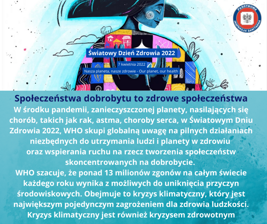 Państwowy Powiatowy Inspektor Sanitarny w Lwówku Śląskim informuje, że Światowy Dzień Zdrowia w 2022 roku będzie przebiegał pod hasłem „Nasza planeta, nasze zdrowie”. Tematem przewodnim jest wpływ kryzysu klimatycznego na zdrowie ludzi na całym świecie.