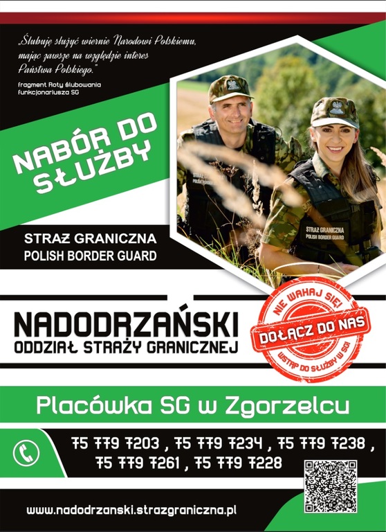 Placówka Straży Granicznej w Zgorzelcu rozpoczyna kampanię promocyjną naboru do Straży Granicznej w miejscowościach w 4 powiatach służbowej odpowiedzialności tj. zgorzeleckim, bolesławieckim, lubańskim i lwóweckim. Kampania informacyjna ma na celu przekonać przyszłych funkcjonariuszy do wstąpienia w szeregi Straży Granicznej.