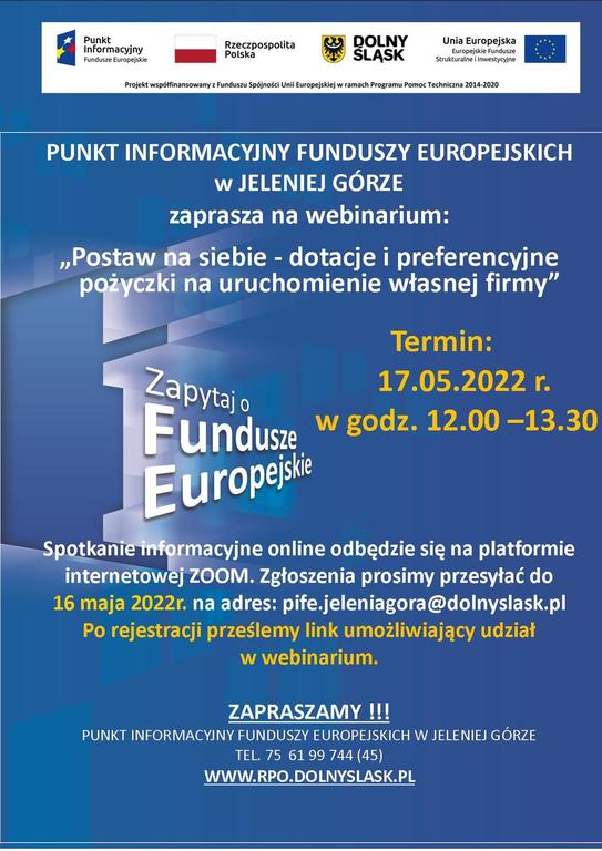 Punkt Informacyjny Funduszy Europejskich w Jeleniej Górze zaprasza na webinarium pt. „Postaw na siebie - dotacje i preferencyjne pożyczki na uruchomienie własnej firmy”. – 17.05.2022 r. Jelenia Góra/online