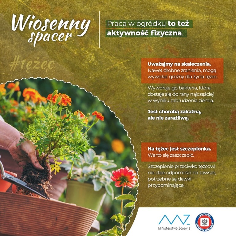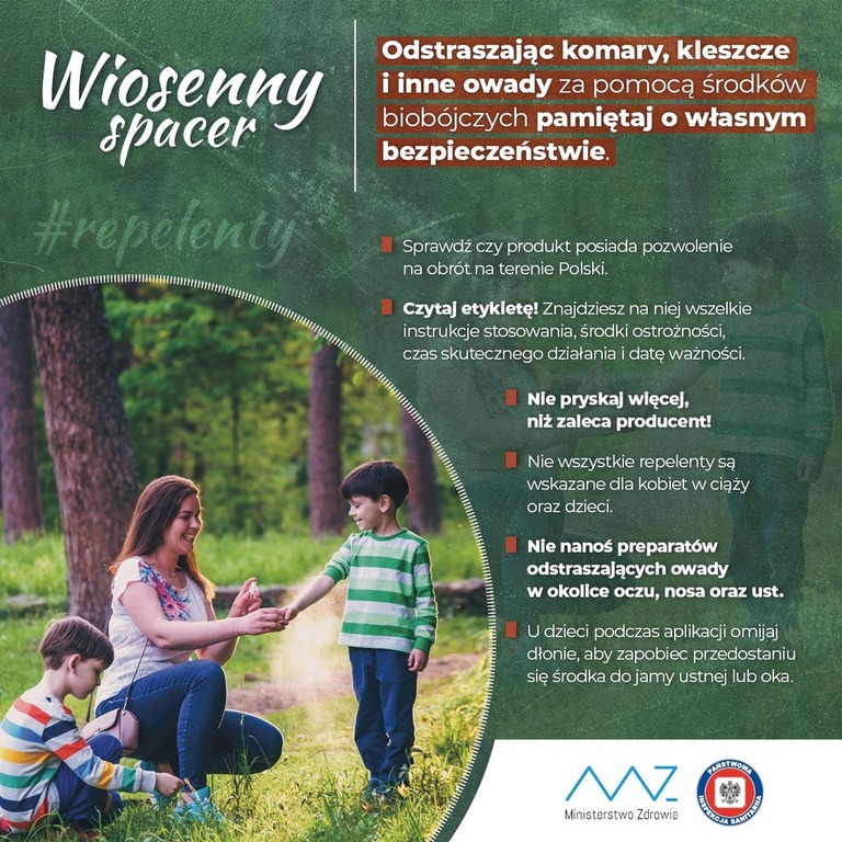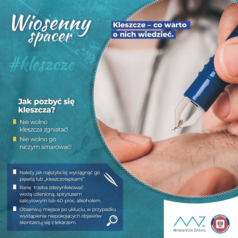 PSSE w Lwówku Śląskim rozpoczyna promującą zdrowie akcję pt.: "Wiosna ach to TY". Wiosna i lato to pory roku, na które wszyscy czekamy: zrobiło się ciepło, dni są coraz dłuższe. Jednocześnie świat staje się bardzo kolorowy: drzewa i krzewy zaczynają kwitnąć, a łąki i trawniki pokrywają się kwiatami. Zwierzęta, które przespały zimę, opuszczają kryjówki. Powracają też ptaki zimujące w ciepłych krajach. Kilka wskazówek na ten piękny czas. Spędź aktywnie majówkowy weekend. Zabierz ze sobą rodzinę, psa i idź na spacer. Maj to doskonały czas na Wiosenny spacer i aktywność na świeżym powietrzu. Na pewno warto chronić się przed ukąszeniami owadów. 🦟 Jak robić to mądrze i bezpiecznie? Wybierasz się na Wiosenny spacer? Doskonale! 🙂 Pamiętaj, że w maju pyli wiele roślin.🌱 Co zrobić, żeby ochronić się przed alergenami? Maj to pora nie tylko na Wiosenny spacer. To także czas intensywnych prac ogrodniczych. 🩸🩹  Pamiętajmy, żeby uważać na skaleczenia - zabrudzone ziemią to prosta droga do zachorowania na #tężec 🏥 Niech Wiosenny spacer upłynie nam bez kleszczy. A jeżeli już przyniesiemy na sobie niechcianego gościa, to poniżej znajdziemy garść porad jak się go pozbyć.