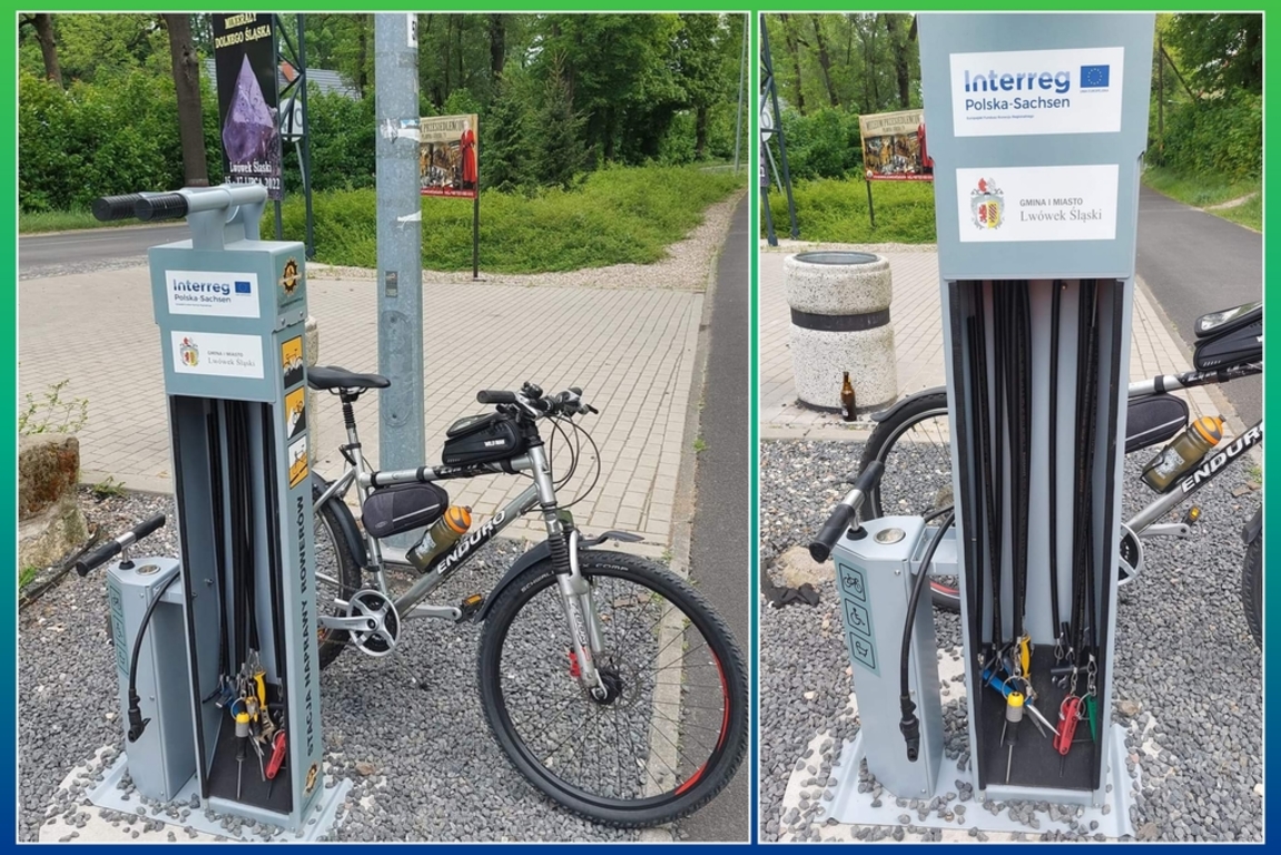 Stacja naprawy rowerów została zakupiona w ramach projektu „Odkryj skarby geologiczne Górnych Łużyc i Dolnego Śląska!”. Projekt współfinansowany jest ze środków Europejskiego Funduszu Rozwoju Regionalnego w ramach Programu Interreg Polska – Saksonia 2014-2020.