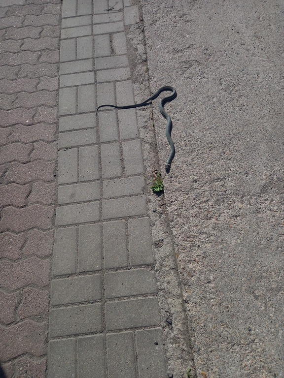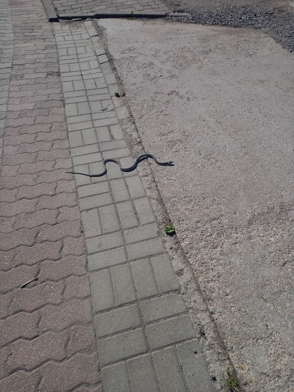 Zwierzęciem okazał się ponad jednometrowej długości wąż – zaskroniec, który długi odcinek drogi pokonał po betonowej kostce, zmierzając w stronę bloku mieszkalnego.