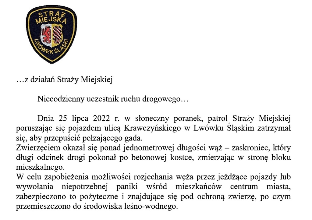 Dnia 25 lipca 2022 r. w słoneczny poranek, patrol Straży Miejskiej poruszając się pojazdem ulicą Krawczyńskiego w Lwówku Śląskim zatrzymał się, aby przepuścić pełzającego gada.