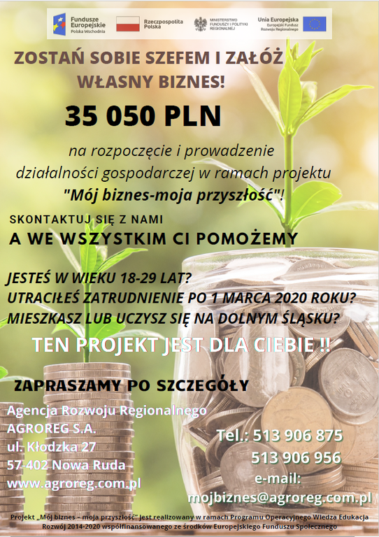 Agencja Rozwoju Regionalnego "AGROREG" S.A. w Nowej Rudzie informuje, że przedłuża nabór do projektu "Mój biznes - moja przyszłość" dofinansowanego ze środków Unii Europejskiej do dnia 31.08.2022 r. do godziny 12:00. W związku z faktem, że jest to ostatni nabór uczestników do projektu, ilość miejsc jest ograniczona.