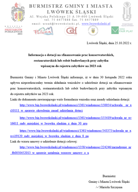 Burmistrz Gminy i Miasto Lwówek Śląski informuje, iż w dniu 30 listopada 2022 roku upływa nieprzekraczalny termin składania wniosków o udzielenie dotacji na sfinansowanie prac konserwatorskich, restauratorskich lub robót budowlanych przy zabytku wpisanym
