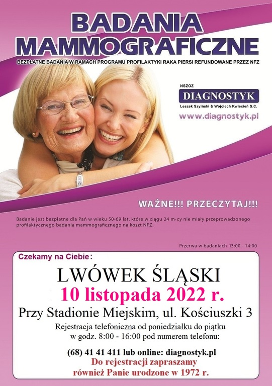 przeprowadzane będą bezpłatne badania mammograficzne dla kobiet w wieku od 50 do 69 lat, które w ciągu ostatnich dwóch lat nie miały wykonywanych tego typu badań. Bardzo zależy nam na tym aby dotrzeć do mieszkanek urodzonych w latach: 1967 r.-1972 r. - te Panie mogą już wykonać badanie w ramach Populacyjnego Programu Wczesnego Wykrywania Raka Piersi.
