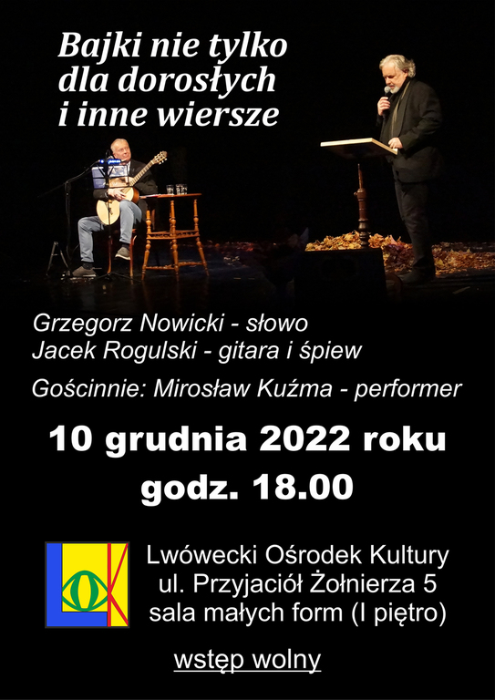 Czekać na Państwa będzie autorska prezentacja wierszy Grzegorza Nowickiego, przeplatana filmowymi i fotograficznymi impresjami z wydarzeń, wprowadzających widzów w magiczny, ale jakże realny świat poezji. To swoisty dialog obu Panów (poety i muzyka), prowadzony artystycznym językiem, począwszy od tematów osobistych, poprzez żarty sytuacyjne, aż po filozoficzne refleksje nad sensem… choćby sensu, skończywszy na bajce - nie bajce Grzegorza Nowickiego o przygodach kultowego już Dzbanka Franka. Podczas wieczoru z poezją prezentowane będą wiersze z publikacji Noc i Dzień - Słowo i Obraz, a także z wcześniejszych tomików poezji Grzegorza Nowickiego: Chciałbym zostawić ślad na śniegu, Wiersze do czytania. W programie również nie wydane jeszcze teksty, które pojawiły się jedynie w mediach społecznościowych autora. ZAPRASZAMY!