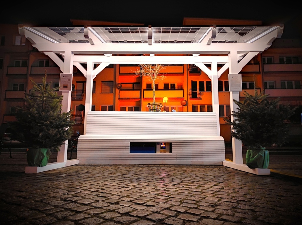 Cztery moduły fotowoltaiczne (każdy 455W) o łącznej mocy 1 820 W, gromadzą energię w ciągu dnia dzięki wbudowanym w ławce akumulatorom o łącznej pojemności 2 040 Wh. Zastosowane dwustronne moduły typu „szkło-szkło” wytwarzają prąd również od strony spodniej, dzięki czemu ich wydajność jest znacznie większa, szczególnie w warunkach zimowych. Dzięki inwerterowi możliwe jest akumulowanie oraz przetwarzanie prądu stałego w prąd przemienny. Ilość zgromadzonej energii elektrycznej w ciagu jednego dnia pozwala w tym przypadku na zasilanie oświetlenia lampek choinki przez 15 godzin lub oświetlenia modułów fotowoltaicznych przez 17 godzin.