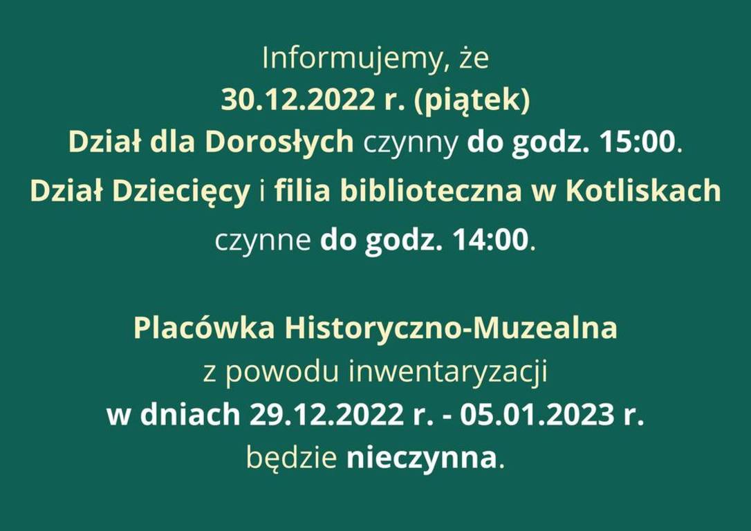 Jak informuje nas Lwówecka Biblioteka Publiczna, od 29 grudnia 2022 r. do 5 stycznia 2023 r. planowane jest zamnięcie ruchu turystycznego w ratuszu w Lwówku Śląskim z powodu inwentaryzacji. Zainteresowanym zwiedzeniem sal - przypominamy, że piątek 6 stycznia 2023 r. (Święto Trzech Króli) jest dniem wolnym od pracy, a zatem Placówka Historyczno-Muzealna również będzie nieczynna.